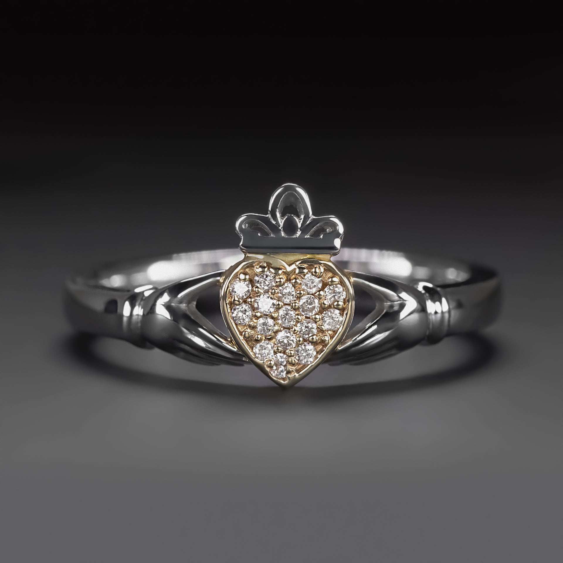 PAVE DIAMOND CLADDAGH RING PLATINUM YELLOW GOLD TRADITIONAL IRISH HEART CROWN
