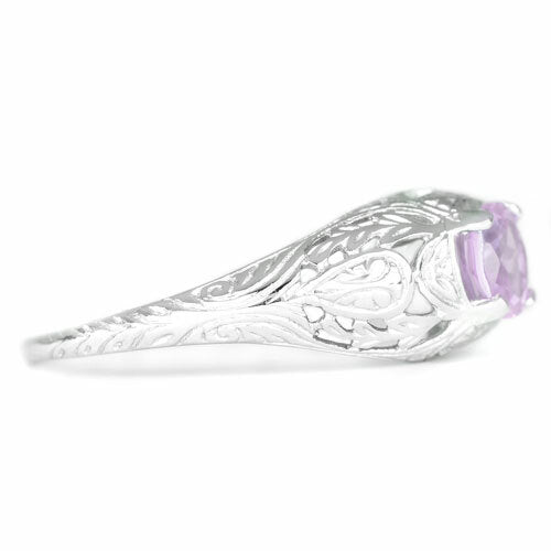 This vintage style ring features a pink amethyst set in a sterling silver setting. The setting is beautifully crafted with floral filigree accents. The pink amethyst is a natural, earth mined stone. The ring measures 7.5mm across (north south) and 5.3mm from finger to top.