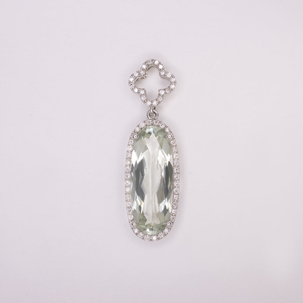 This striking prasiolite (green amethyst) and diamond pendant offers a classic look with a sea green prasiolite surrounded by glittering white diamonds!