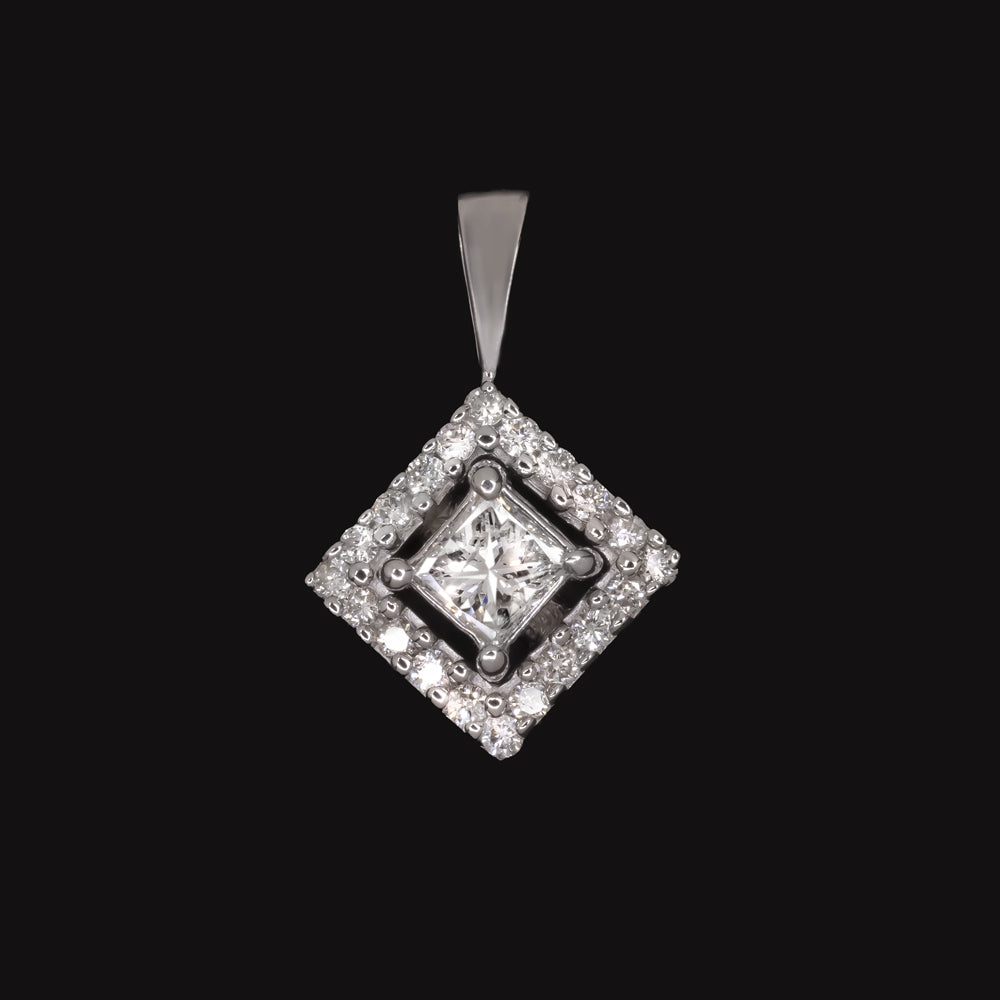 This diamond pendant features a lively princess cut diamond surrounded by a vibrant square halo.
