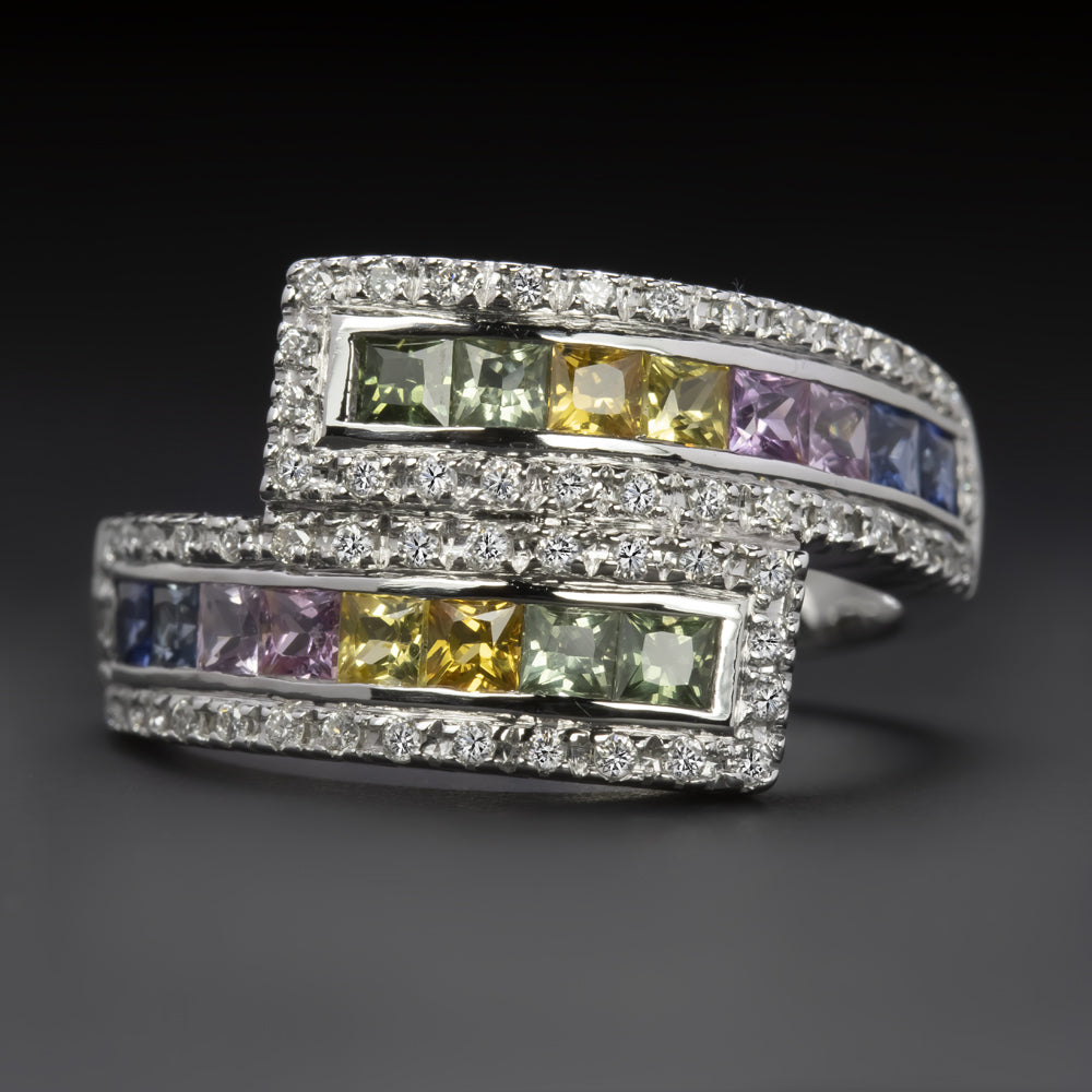 RAINBOW SAPPHIRE DIAMOND COCKTAIL RING 6.3gm 18k WHITE GOLD BYPASS MENS LADIES
