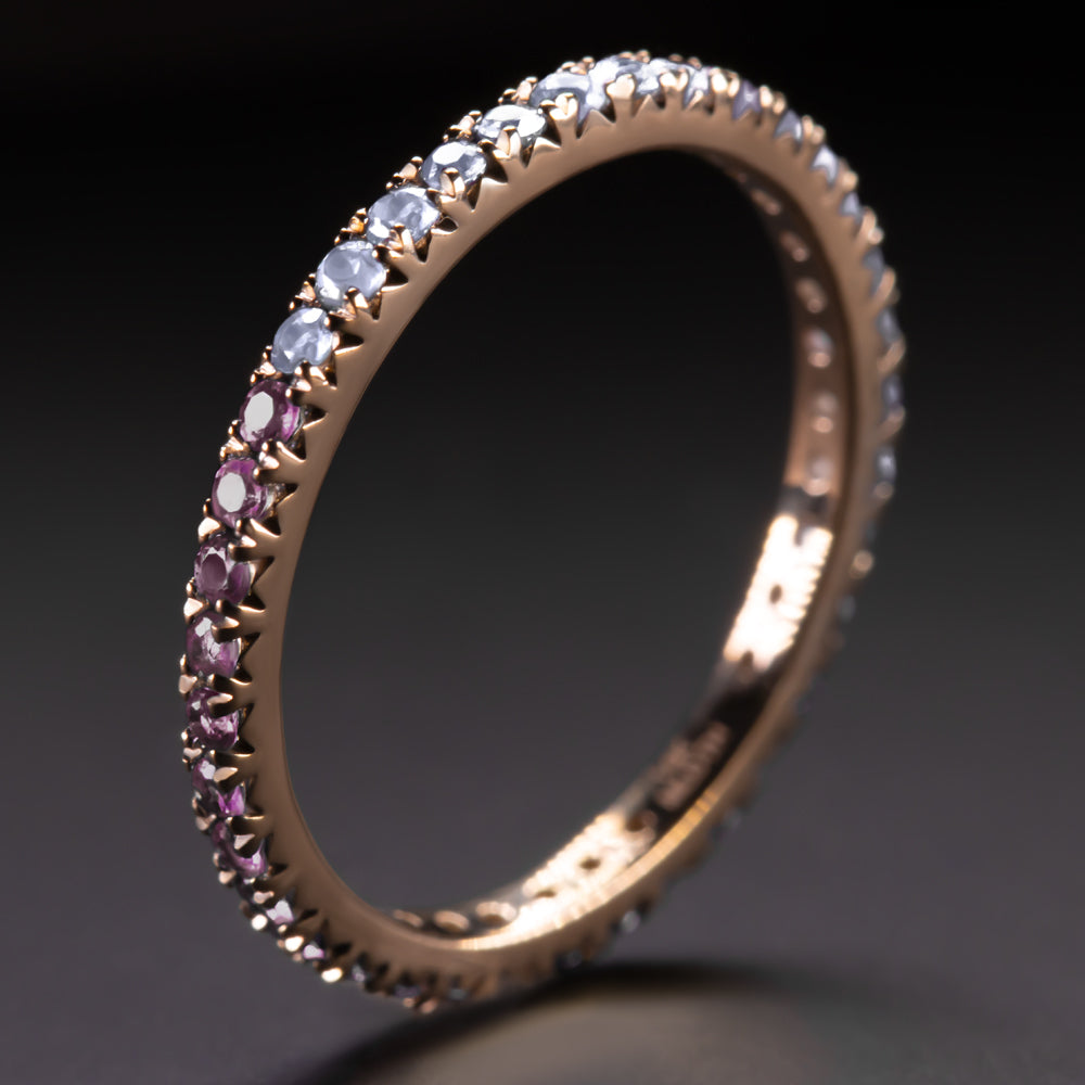 Set with tanzanites and rhodolite garnets, this elegant eternity ring offers rich color and timeless design with a modern twist. One half of the ring is set with fuschia rhodolite garnets, while the other half of the ring is set with blue tanzanites. This versatile half and half design can be rotated to produce a variety of looks!