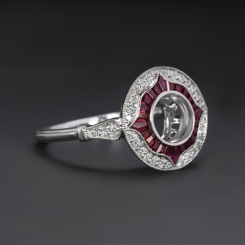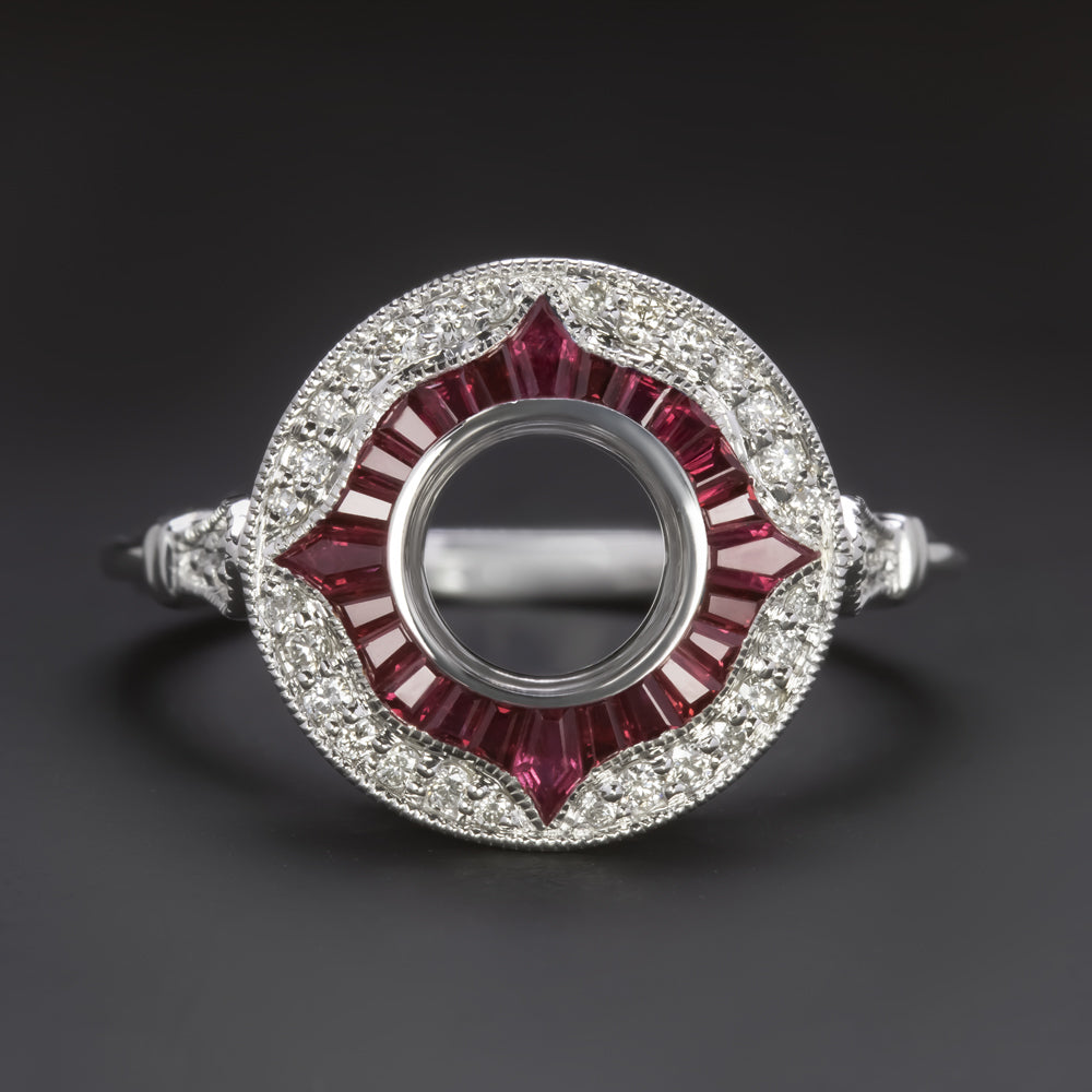 This gorgeous semi-mount is a beautifully designed modern twist on an Art Deco era target ring. The setting is encircled by rich red custom cut natural rubies which curve up to points at the compass points. The rubies are set off by a border of bright diamonds. Finished with fine milgrain details, this setting provides the perfect backdrop for a diamond or gemstone of your choice.