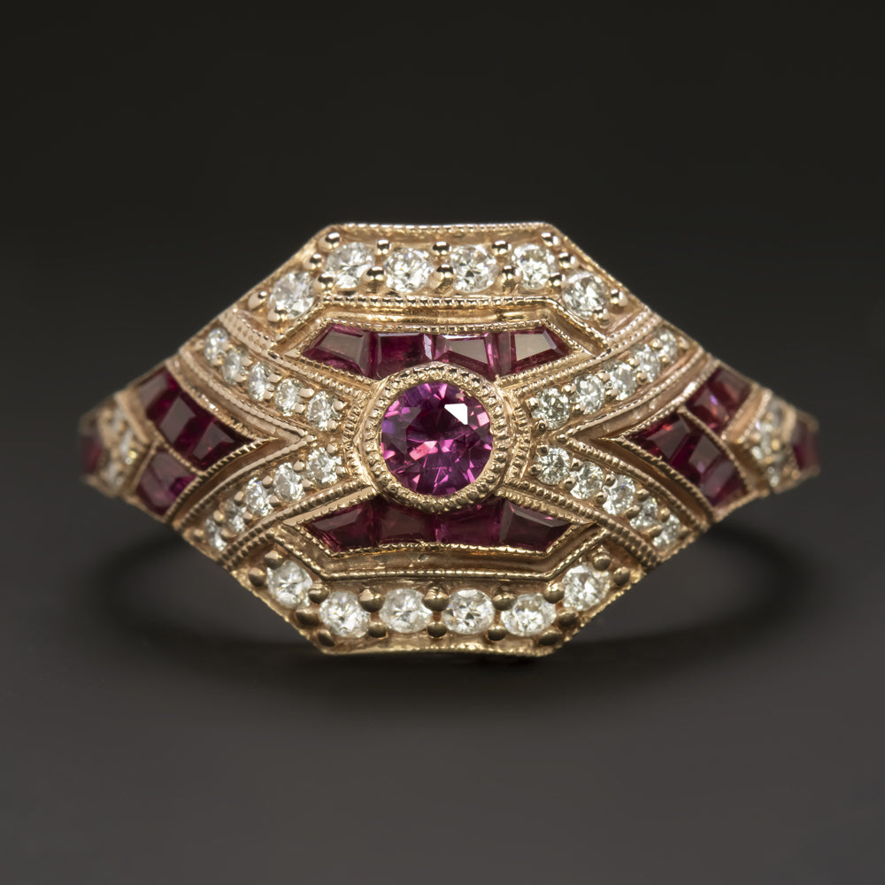 This diamond and ruby ring is beautifully crafted with a geometric Art Deco style design and encrusted with glittering diamonds and rich red rubies!
