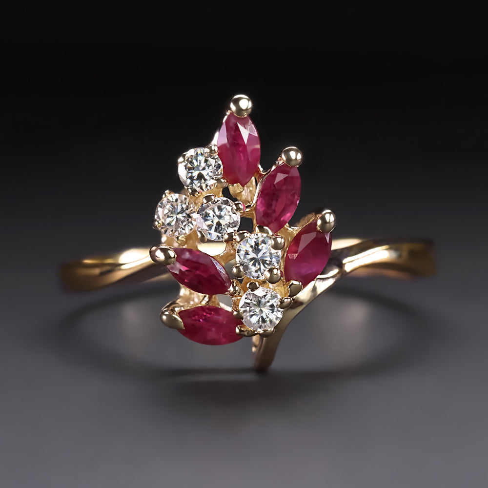 RUBY DIAMOND COCKTAIL RING 14k YELLOW GOLD CLUSTER STATEMENT NATURAL RED