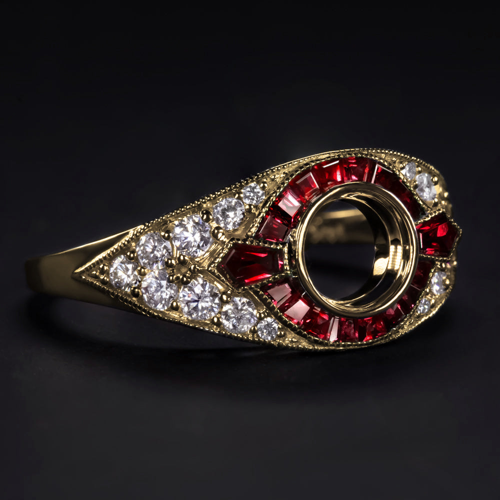 This diamond and ruby semi mount setting has an iconic Art deco design with a glittering field of bright diamonds punctuated by a halo of calibre cut rubies.