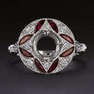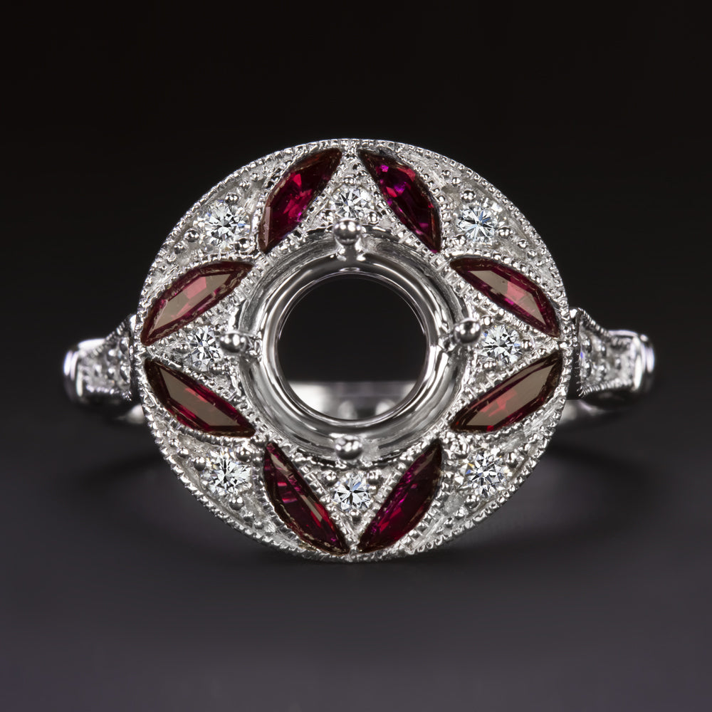 This diamond and ruby semi mount setting has an iconic Art deco design with a glittering diamond halo punctuated by rich red custom cut rubies.