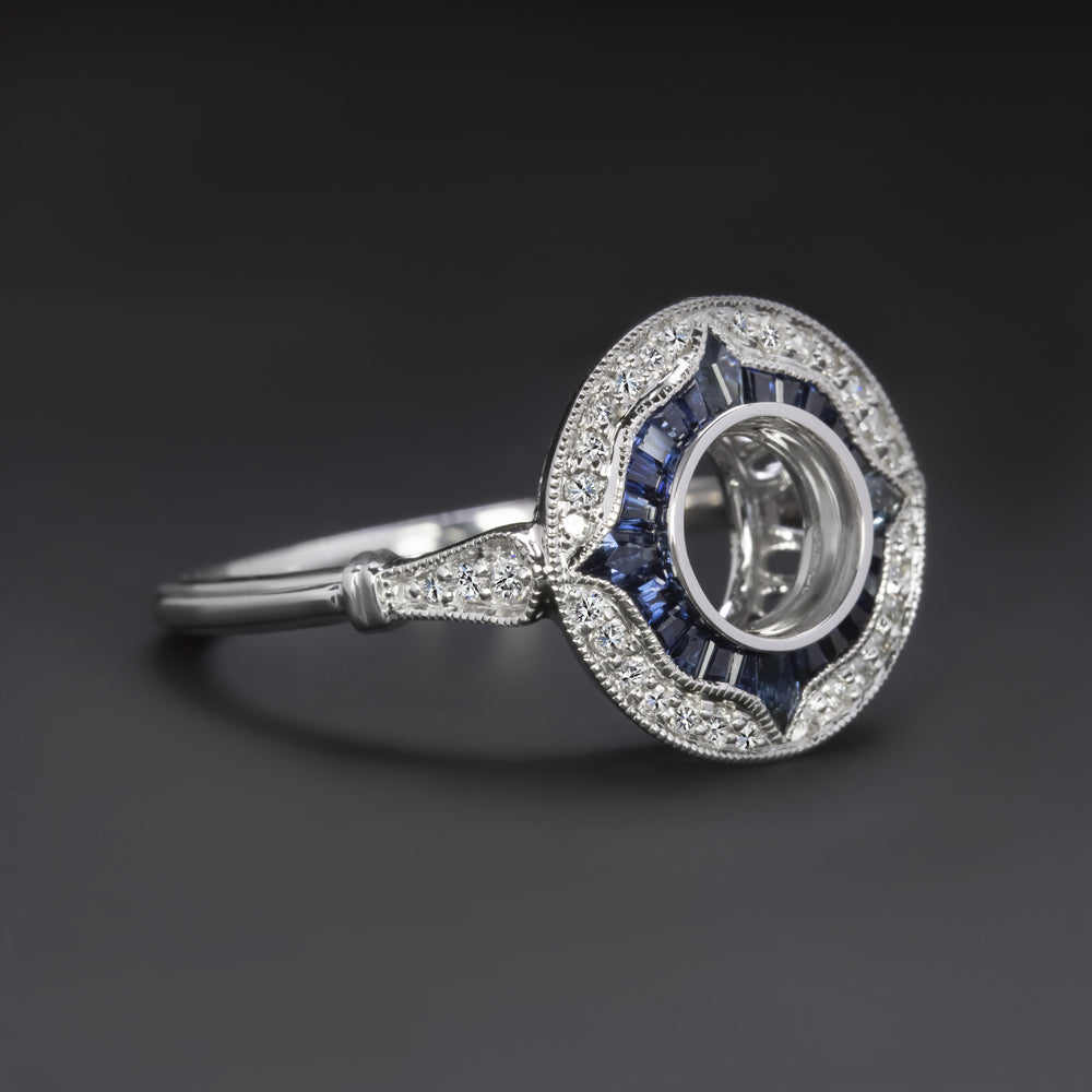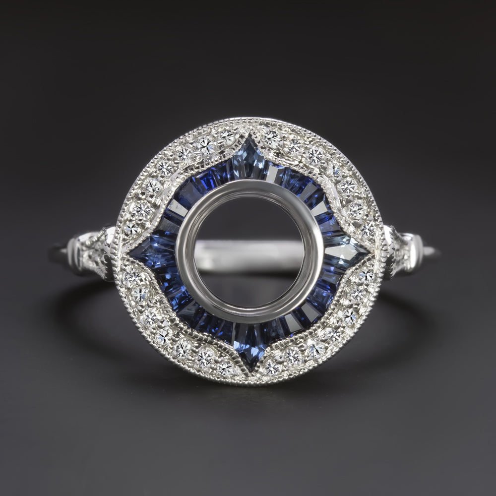 This gorgeous semi-mount is a beautifully designed modern twist on an Art Deco era target ring. The setting is encircled by rich blue custom cut natural sapphires which curve up to points at the compass points. The sapphires are set off by a border of bright diamonds. Finished with fine milgrain details, this setting provides the perfect backdrop for a diamond or gemstone of your choice.