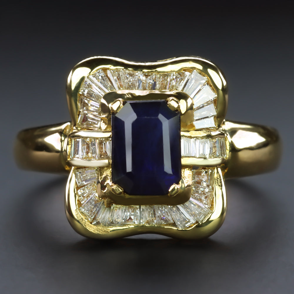 SAPPHIRE DIAMOND COCKTAIL RING EMERALD CUT BAGUETTE HALO 14k YELLOW GOLD NATURAL