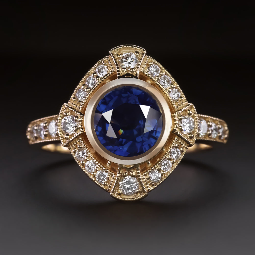 SAPPHIRE DIAMOND COCKTAIL RING VINTAGE STYLE HALO ART DECO 14k YELLOW GOLD ROUND