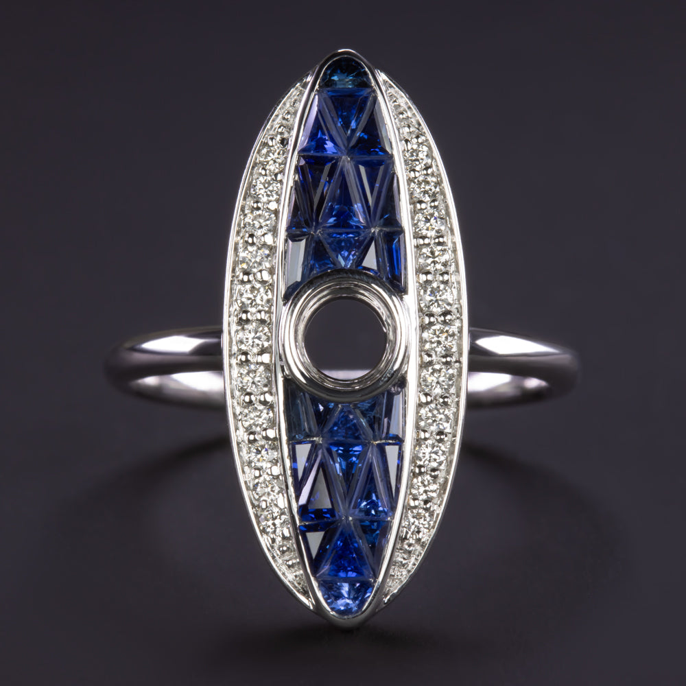 This diamond and sapphire semi mount setting has an iconic navette shape featuring rich blue custom cut sapphires bordered by glittering diamonds.