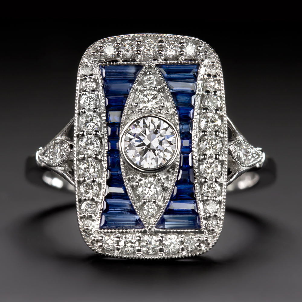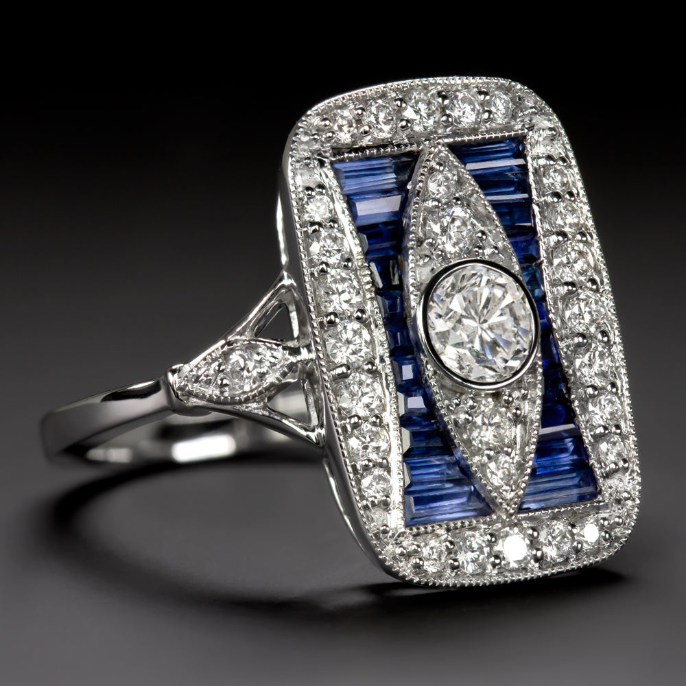 This diamond and sapphire ring features natural diamonds and sapphires in a stunning Art Deco style design with rich color, and gorgeous sparkle!