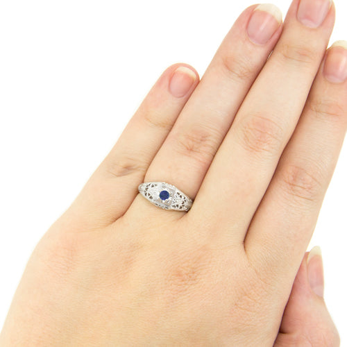 This vintage style ring features a rich blue sapphire set in a sterling silver setting. The setting is beautifully crafted with ethereal filigree. The sapphire is a natural, earth mined stone. The ring measures 7.8mm across (north south) and 6.2mm from finger to top.
