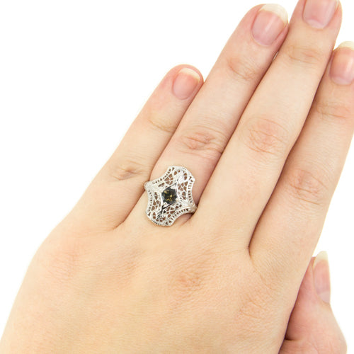 This vintage style ring features a smoky quartz set in a sterling silver setting. The Art Deco style setting is beautifully crafted with ethereal, web-like filigree and an elegant navette shape. The quartz is a natural, earth mined stone. The ring measures 19.9mm across (north south) and 5.7mm from finger to top.