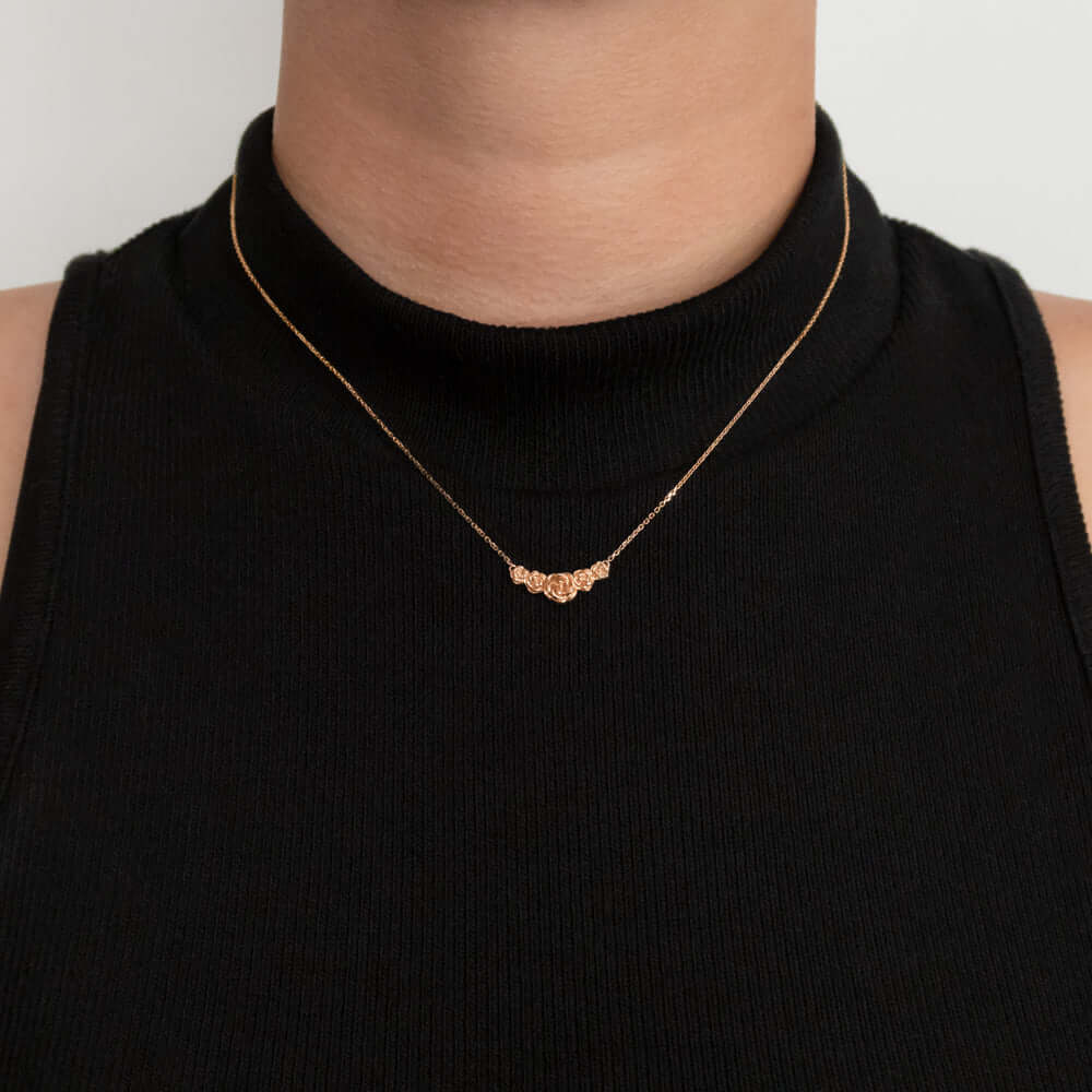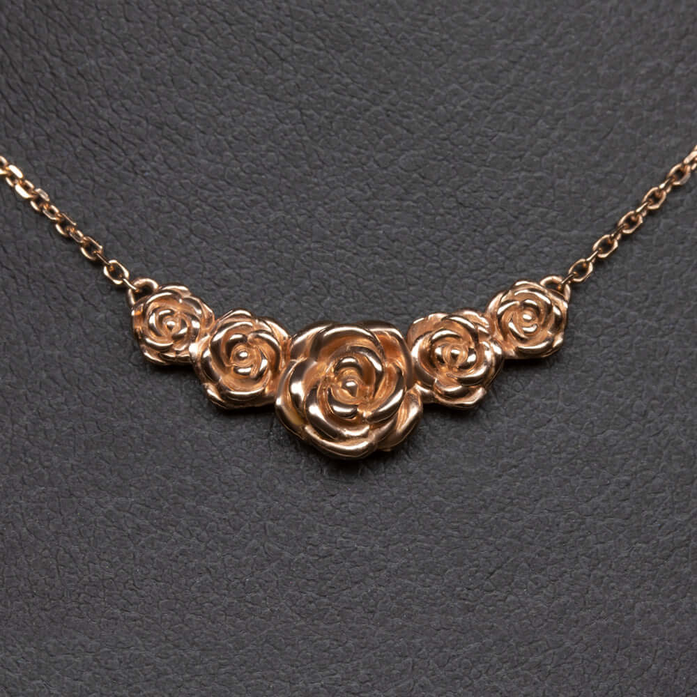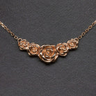 This beautiful and unique botanical necklace features a cluster of blossoming roses intricately rendered in 14k rose gold. Inspired by the boundless and surprising beauty of the natural world, this necklace offers a dreamy air of fairytale romance! The necklace is pictured in solid 14k rose gold and can be made in yellow or white gold as well. The pendant measures 21.6 x 8.8mm. The chain is 18 inches in length.
