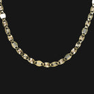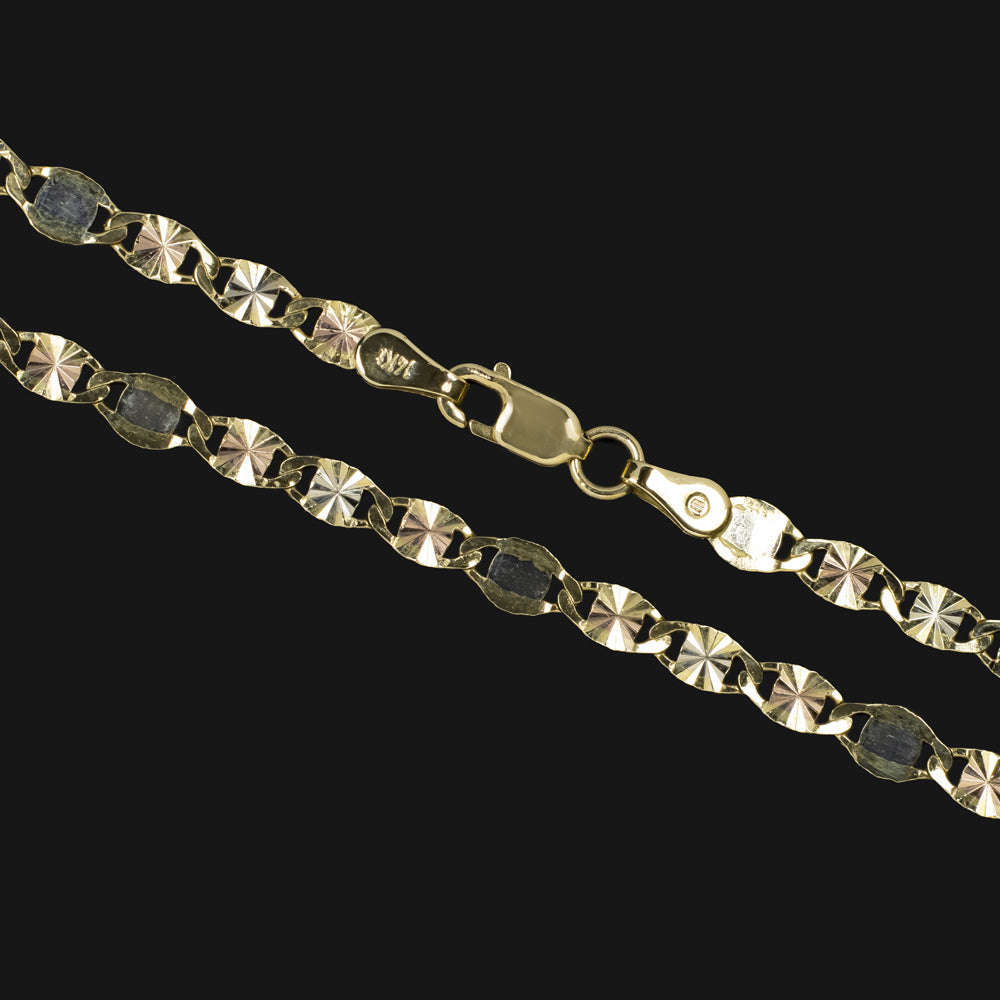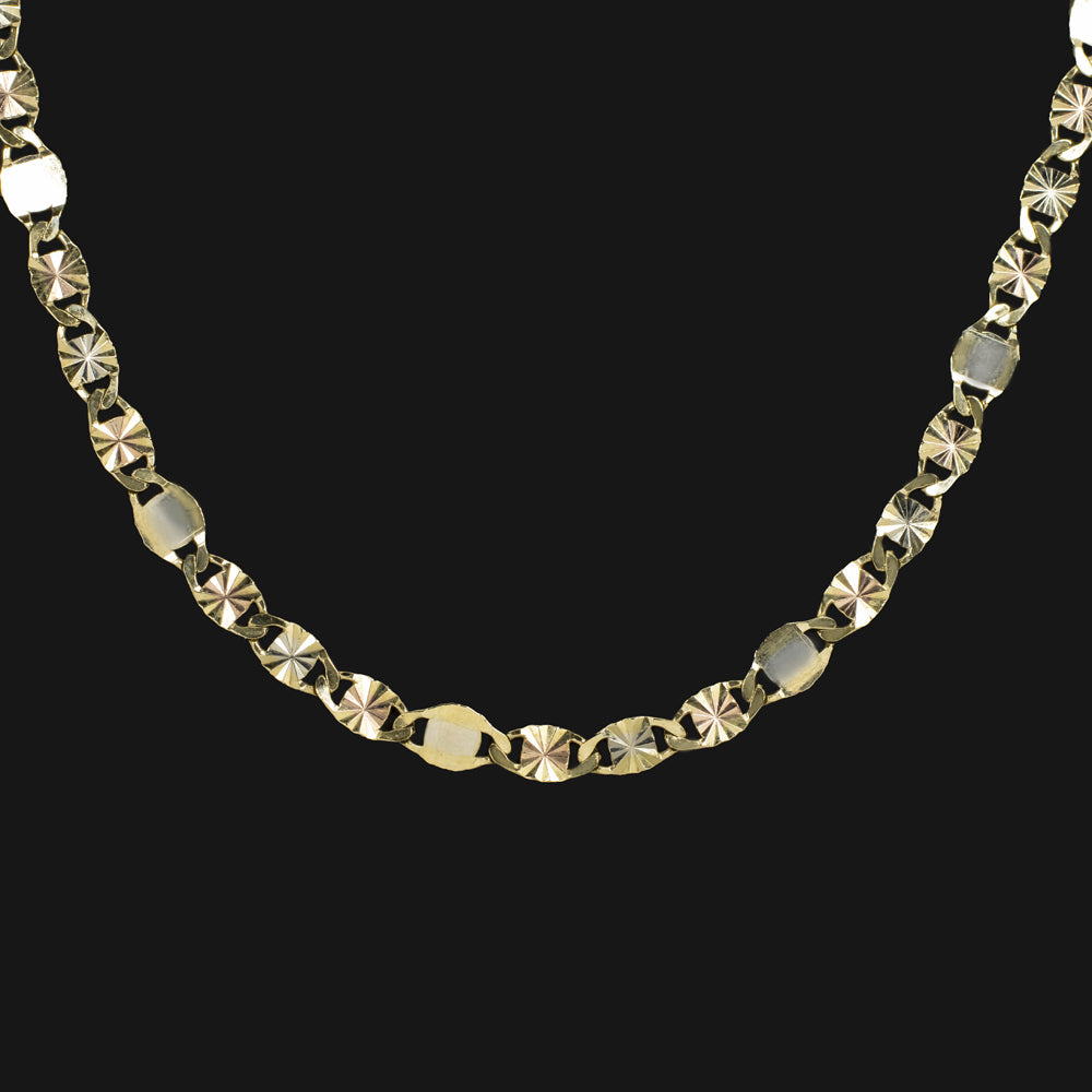 This solid 14k tri tone gold chain necklace is stylish and versatile with a sturdy look and feel. The chain is high quality and has a beautiful and unique link style. The links are crafted in 14k yellow gold with a stripe of white or rose gold down the center. They have a starburst texture that catches the light beautifully. This is quite a unique and rare style! It is finished with a lobster clasp.