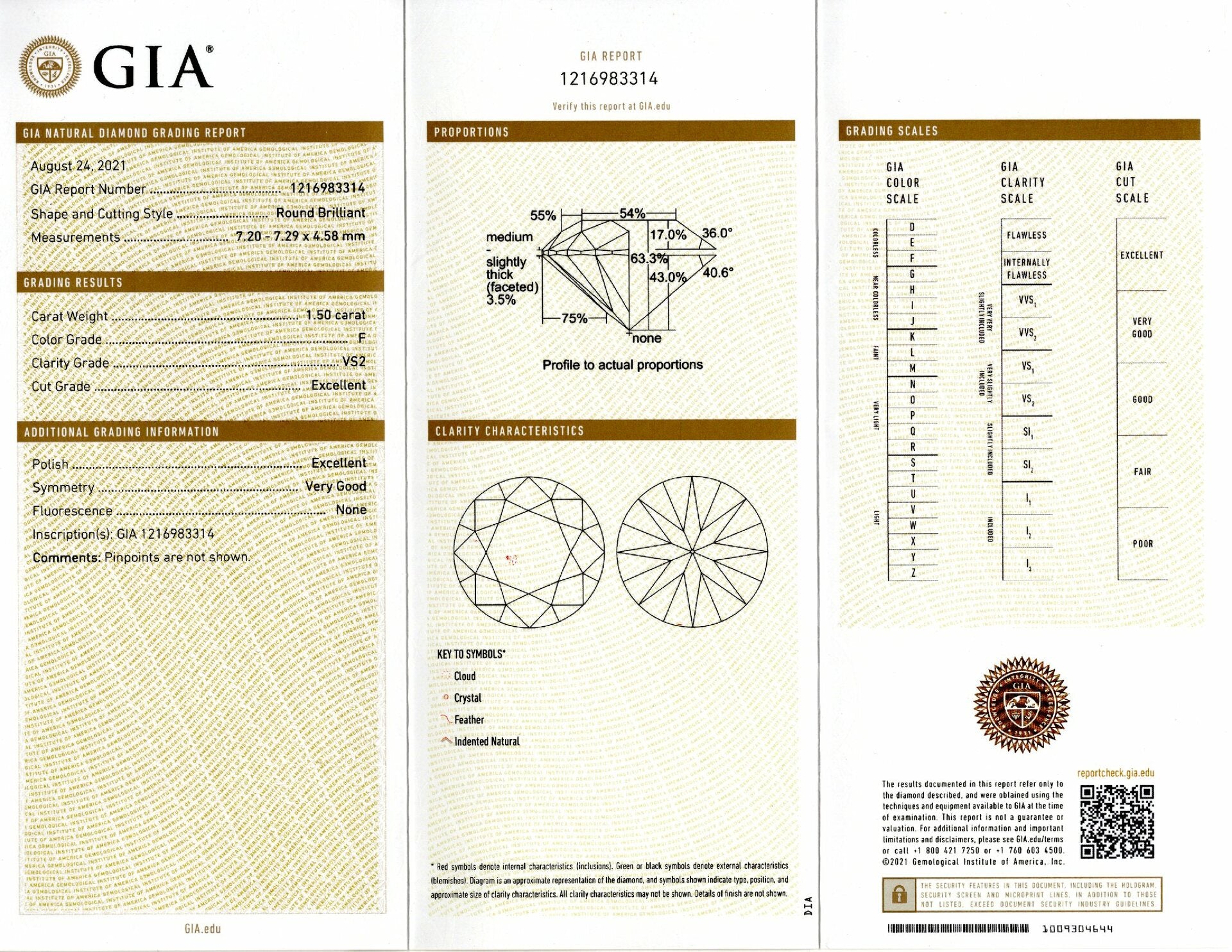 1.5ct GIA CERTIFIED F VS2 EXCELLENT CUT DIAMOND ROUND BRILLIANT LOOSE NATURAL