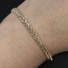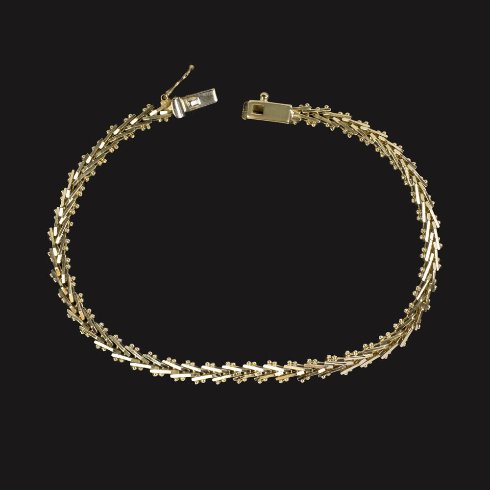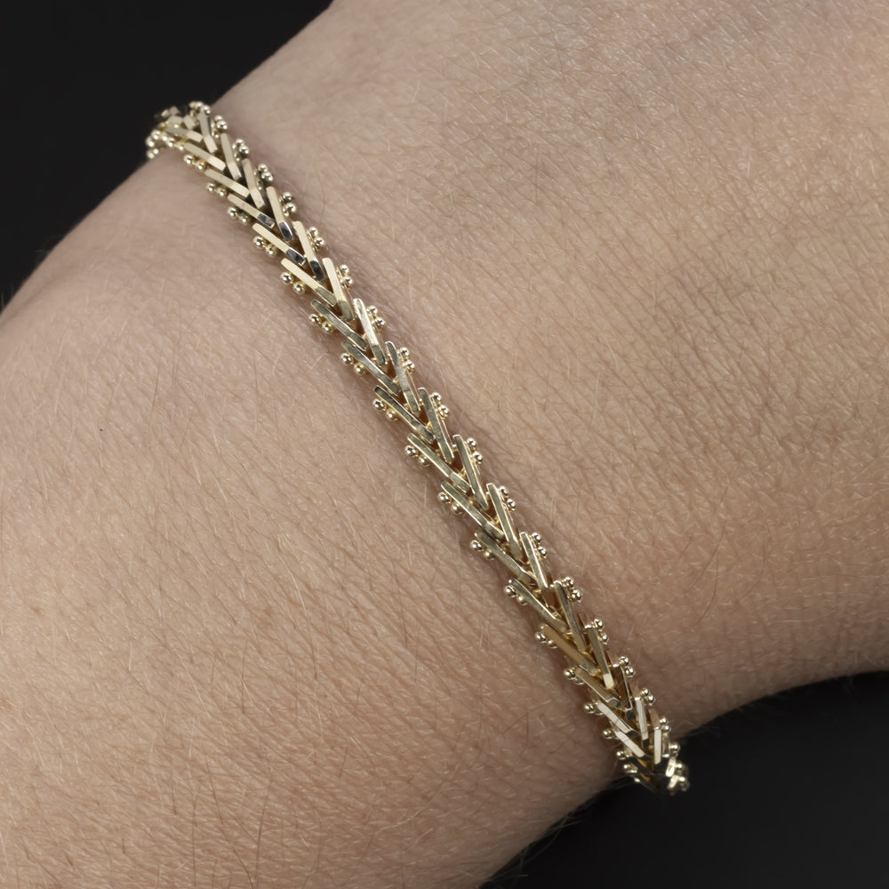 This 14k yellow gold bracelet offers a unique twist on a classic look. The herringbone links and bead details create a beautiful texture!