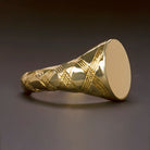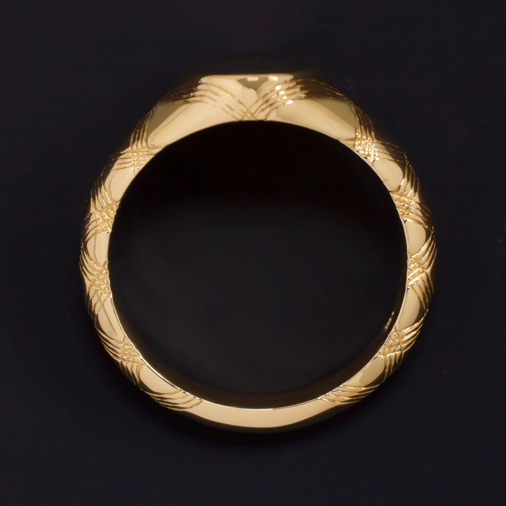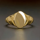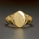 This elegant signet ring is substantial in size and adorned with hand engraved details on the shank. The oval shaped blank face can be personalized with a monogram or other engraving of your choice. The last photo shows an example of our hand engraved lettering. Please get in touch to add on a monogram!