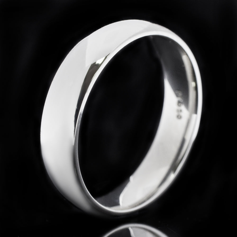 This broad solid platinum band has a satisfying domed profile. It is suitable for any gender.