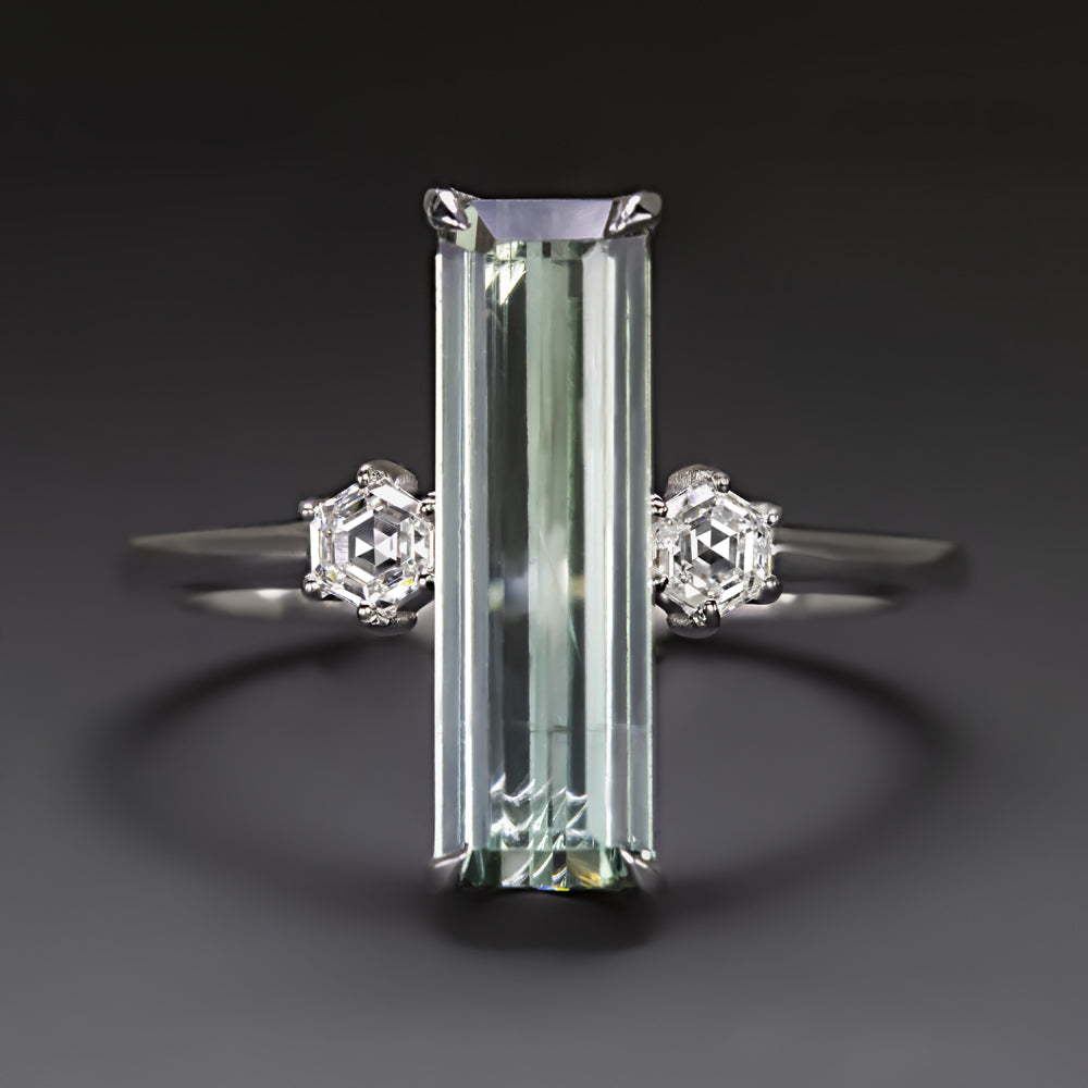 This tourmaline and diamond ring features a unique and stunning extra long teal tourmaline flanked by a pair of glittering hexagon cut diamonds for a sleek and sophisticated finish.