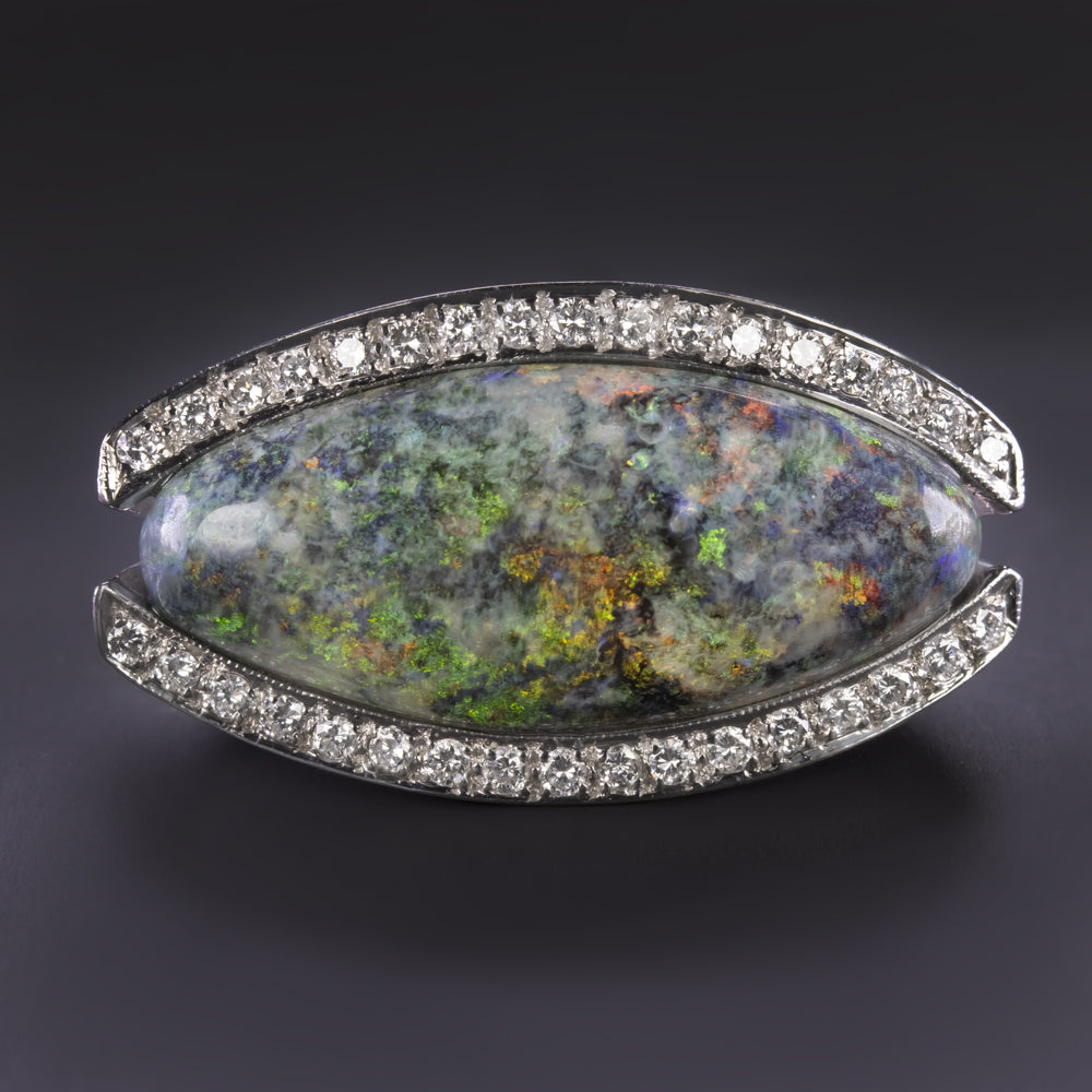 This stunning cocktail ring has a fantastic large look with a head turning 16 carat opal bordered by bright glittering ribbons of diamonds.