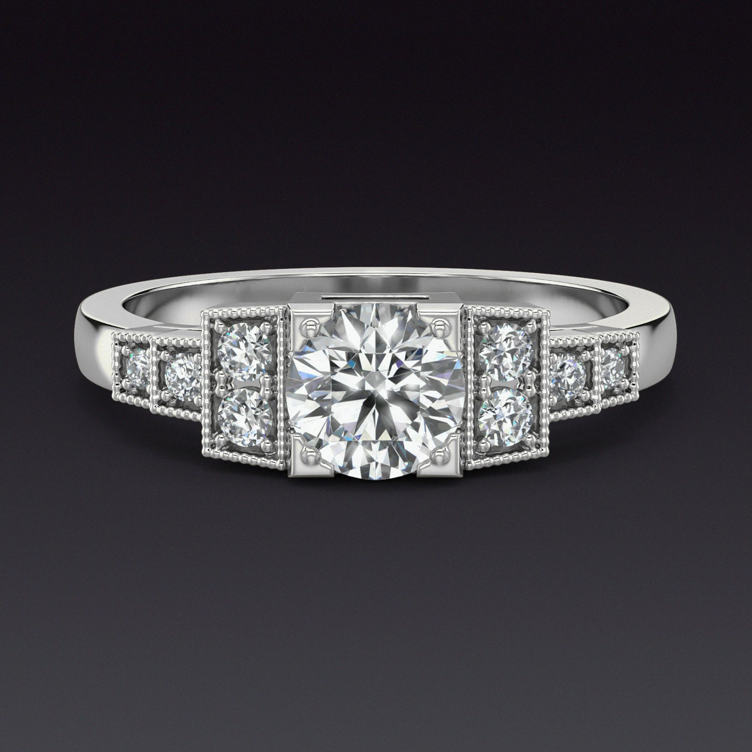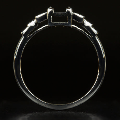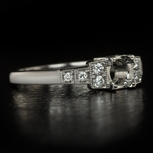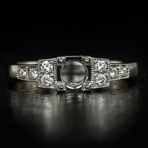 Take her breath away with this exquisite diamond ring setting reminiscent of the 1930s-1940s. This beautiful vintage inspired ring will fit a round cut stone measuring 4.3mm to 5.3mm. If you do not have the perfect stone for this setting, please contact us for our loose stone inventory! We are sure to have something you will love that will be the perfect fit for this mounting. This stunning ring setting features eight round brilliant cut diamond side stones. These diamonds are bright white and clean, free from any visible imperfections. All of the stones are natural, earth-mined diamonds that have not received treatments or enhancements of any kind. The ring is made from solid 14 karat white gold and measures 5.0mm across (north-south) and 4.0mm from the finger to the top of the ring. The vintage inspired ring has lovely milgrain edging to give it a true Art Deco style. Make this vintage inspired setting yours today! It will make a lovely engagement ring, or perfect addition to your own jewelry collection. This is a one of a kind design that can only be found here!