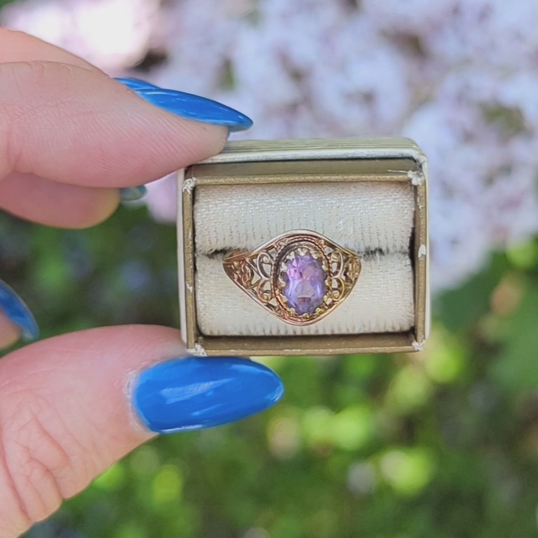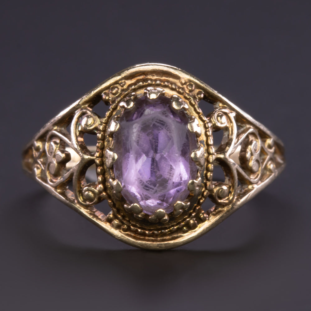 VINTAGE AMETHYST 10k YELLOW GOLD RING OVAL SHAPE CUT FILIGREE NATURAL COCKTAIL
