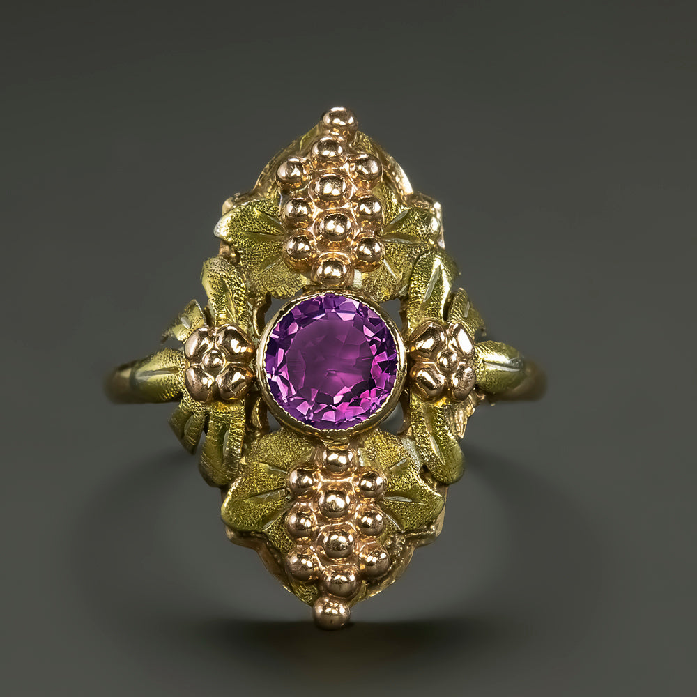 This unique vintage ring features a bright purple amethyst set at the center of a tri tone gold design with green gold leaves and rose gold grapes and yellow gold flowers!