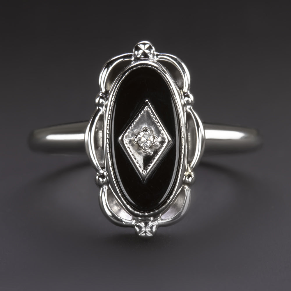 VINTAGE COCKTAIL RING DIAMOND OVAL BLACK ONYX WHITE GOLD FILIGREE ART DECO ERA