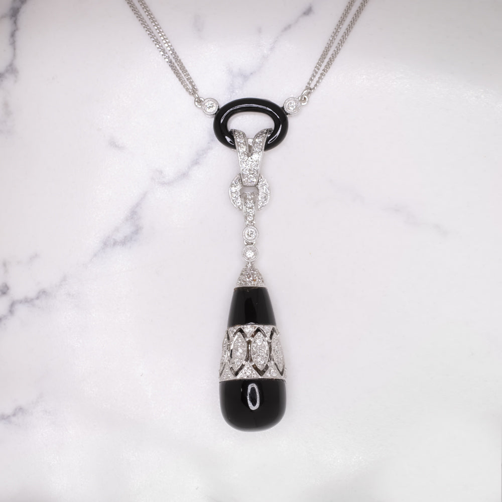 This elegant vintage drop necklace features striking composition and contrast with glittering diamonds interspersed with swatches of rich black onyx!