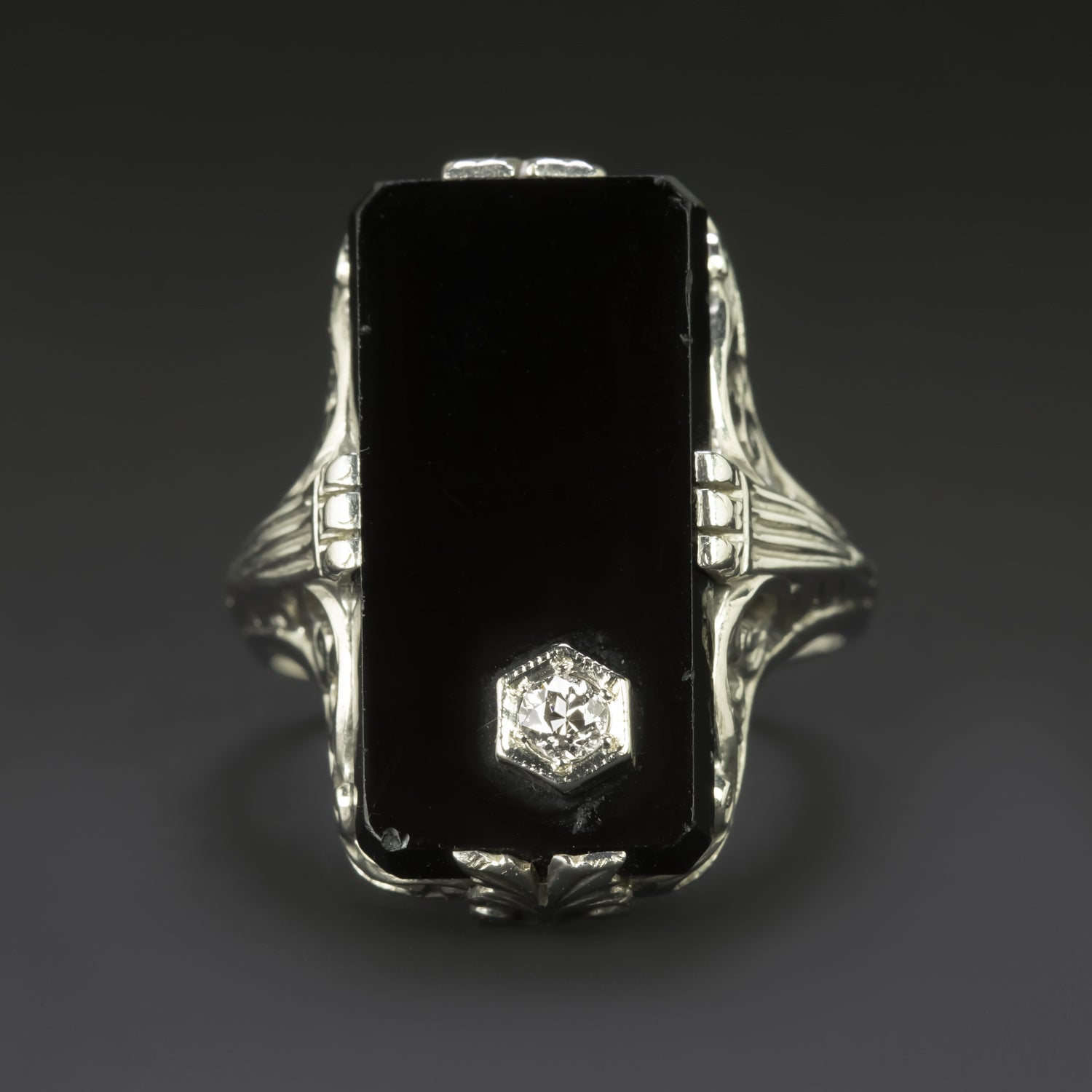 This vintage diamond and black onyx ring has a striking design. A long rectangular onyx is set off by a glittering diamond accent and encased in intricate filigree.