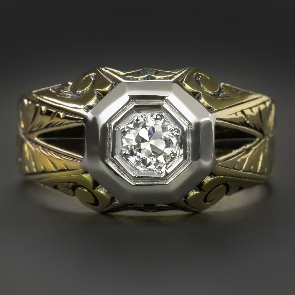 VINTAGE DIAMOND CHUNKY COCKTAIL RING MENS ENGRAVED YELLOW GOLD ART DECO OLD CUT