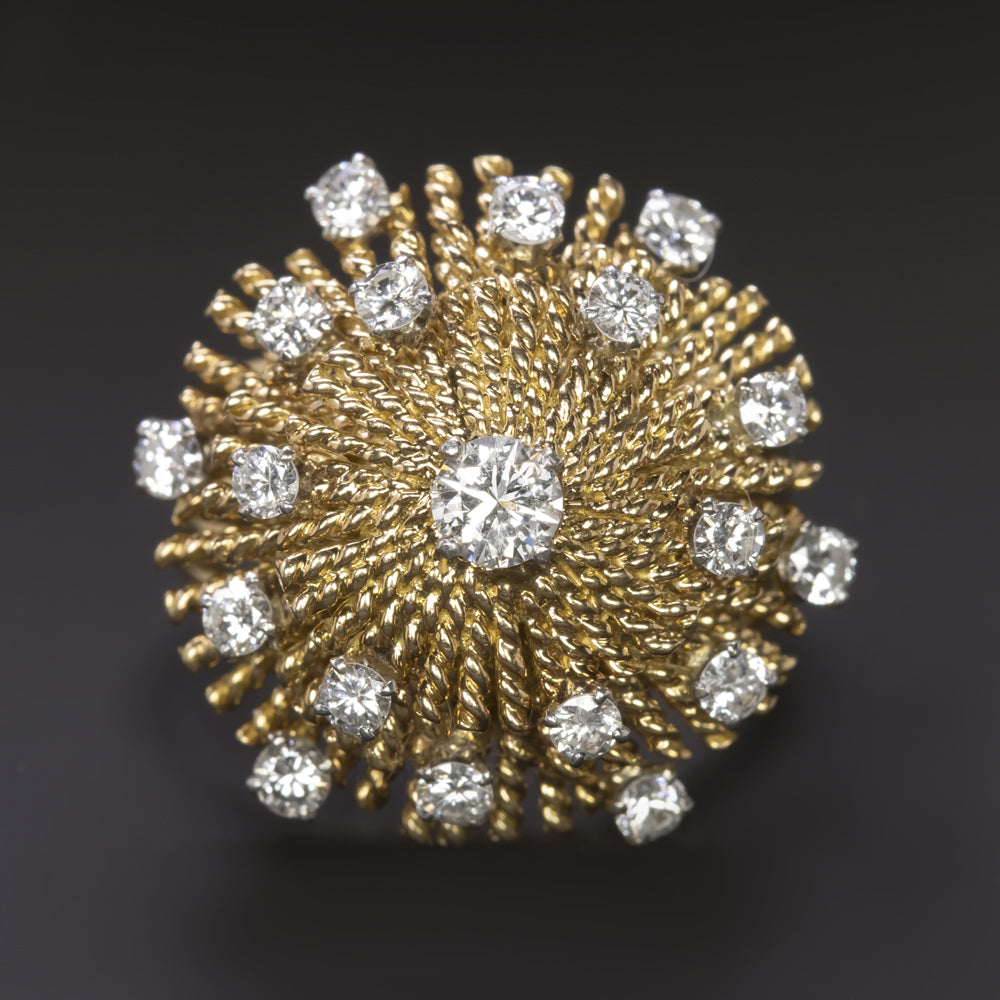 This vintage diamond ring is very high quality and a fantastic, one of a kind piece! With bright diamonds set amidst luxurious tiers of 18k gold twists, this French estate piece is a masterful work of art!