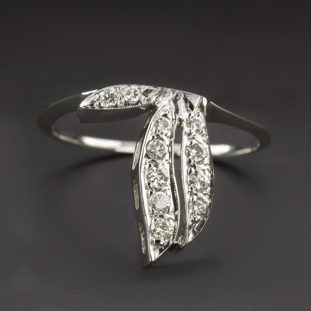 VINTAGE DIAMOND COCKTAIL RING MID CENTURY RIBBON 14k WHITE GOLD NATURAL DAINTY