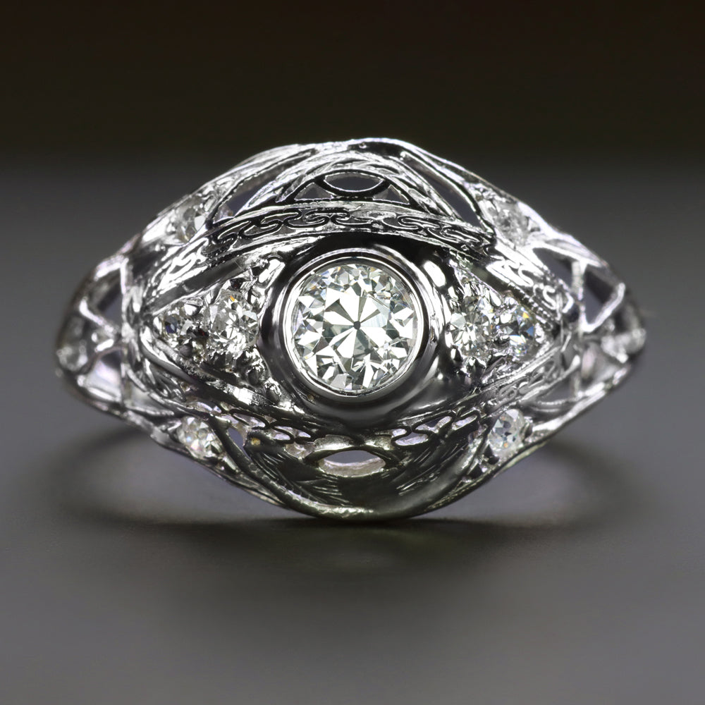 VINTAGE DIAMOND COCKTAIL RING PLATINUM OLD EUROPEAN CUT DOME FILIGREE ART DECO