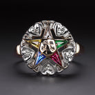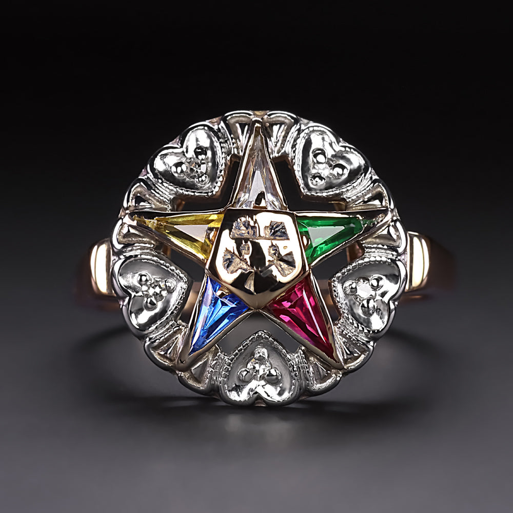 An enduring connection to the past both in symbology and provenance, this vintage Eastern Star ring is a striking and vintage keepsake. An offshoot of the Free Masons, the Order of the Eastern Star was founded in the mid-1800s and is a fraternal order open to both men and women. In accordance with the Eastern Star symbol, each point of the star is set with a different hue of custom cut gemstone.