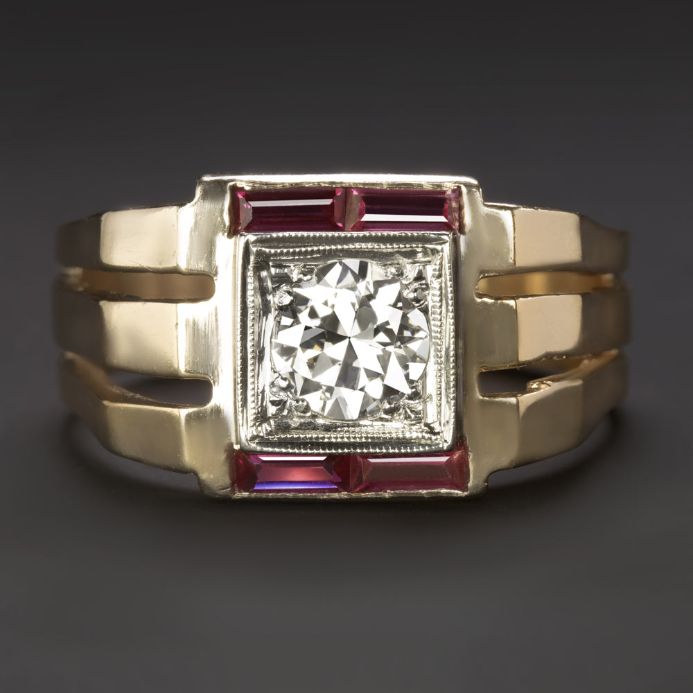 VINTAGE DIAMOND RUBY CHUNKY COCKTAIL RING MENS 14k YELLOW GOLD ART DECO OLD CUT