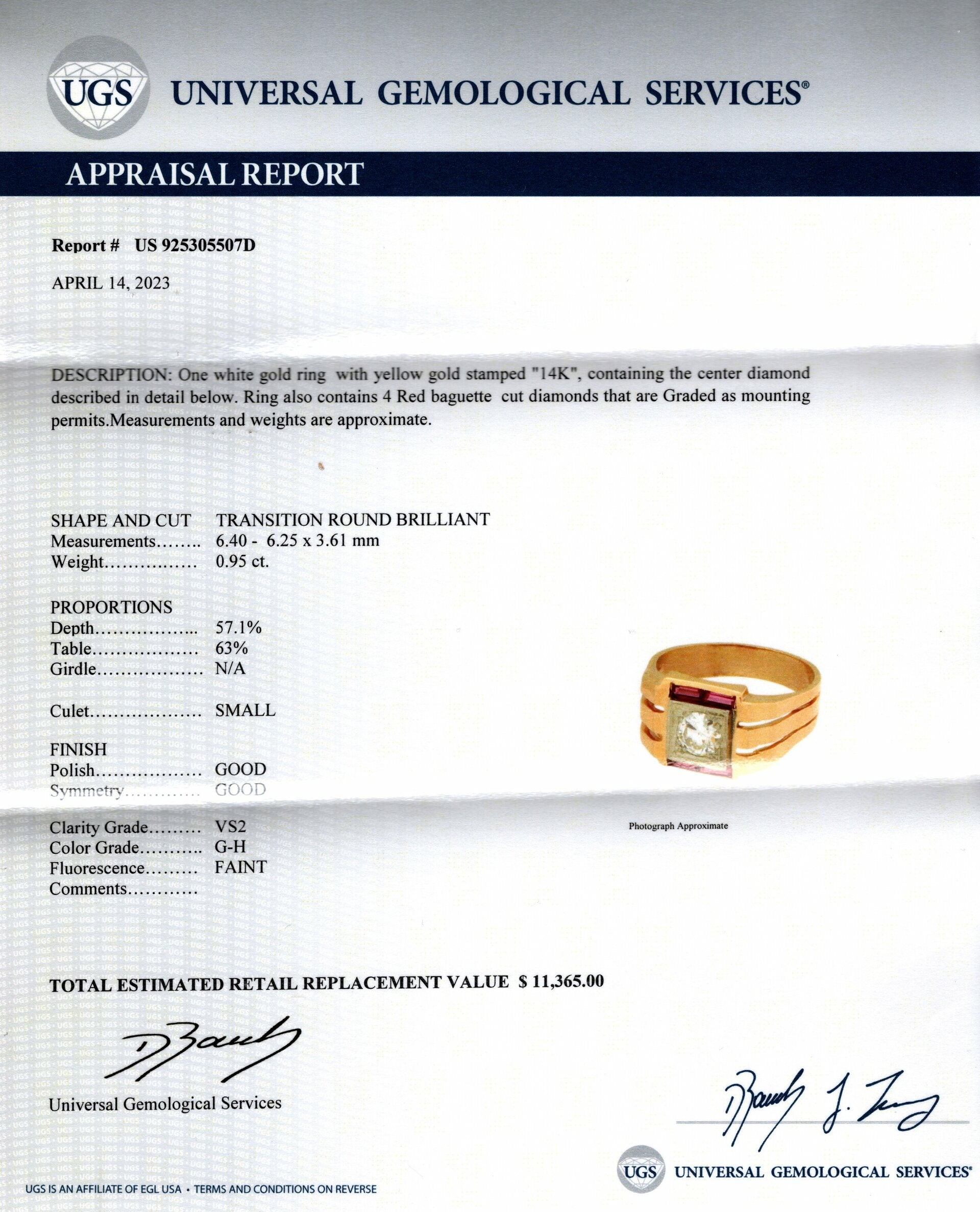 Crafted in the late Art Deco era, this vintage ring is a fantastic find with a satisfying, chunky design and a 0.95ct old transitional cut diamond center! Hand crafted in 14k yellow and white gold and punctuated by rich red rubies, the ring has a big and bold impact!