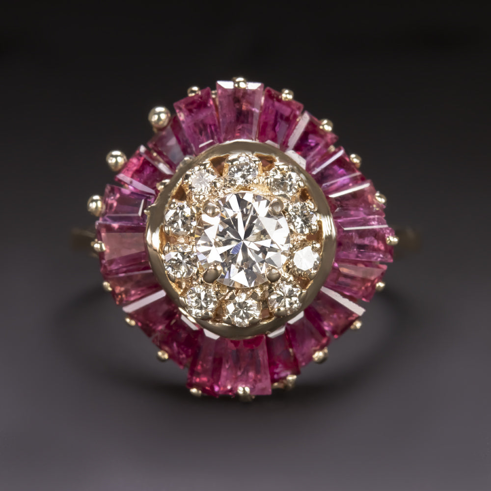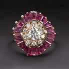 VINTAGE DIAMOND RUBY COCKTAIL RING 14k YELLOW GOLD BALLERINA CLUSTER NATURAL