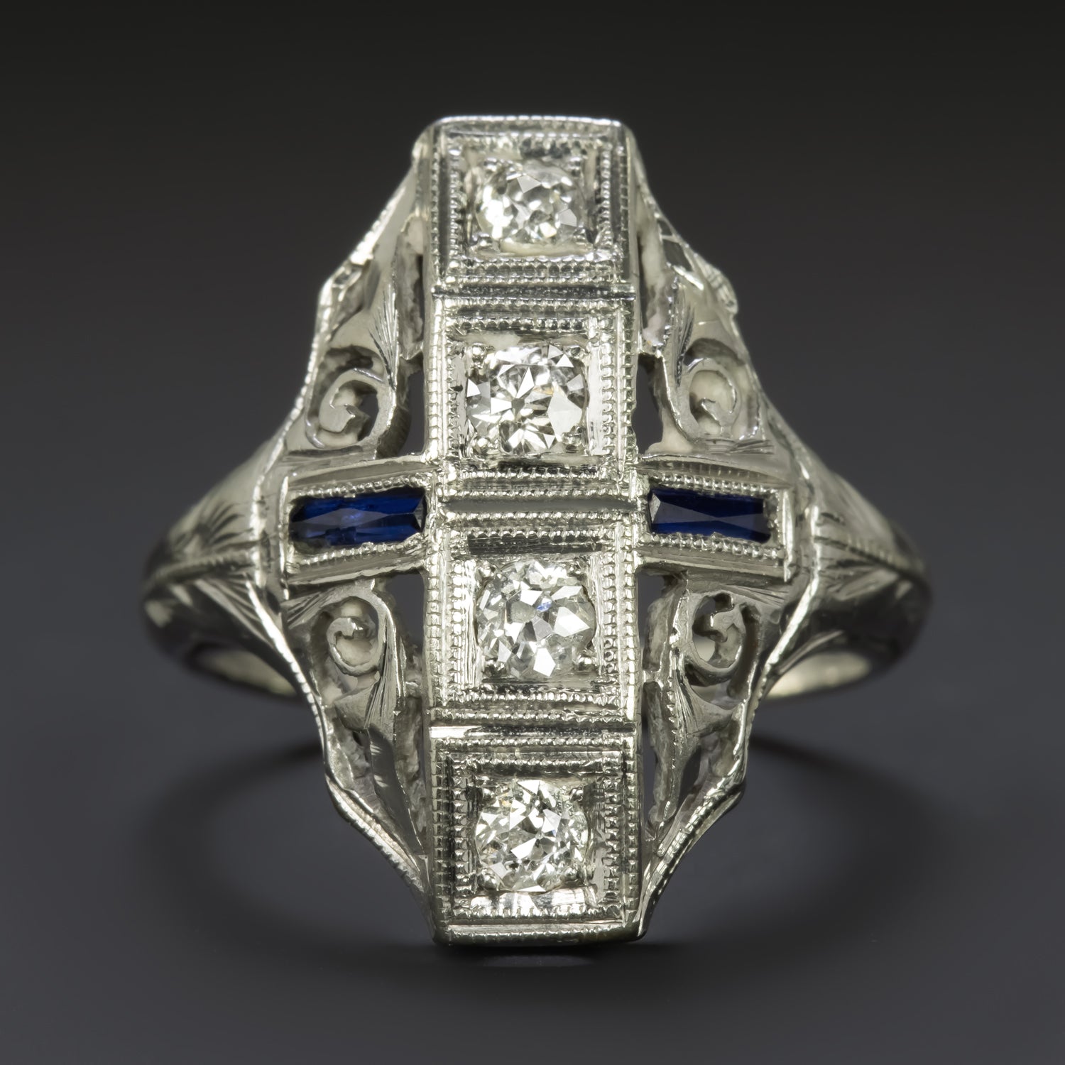 VINTAGE DIAMOND SAPPHIRE COCKTAIL RING BELAIS ART DECO 18k WHITE GOLD FILIGREE