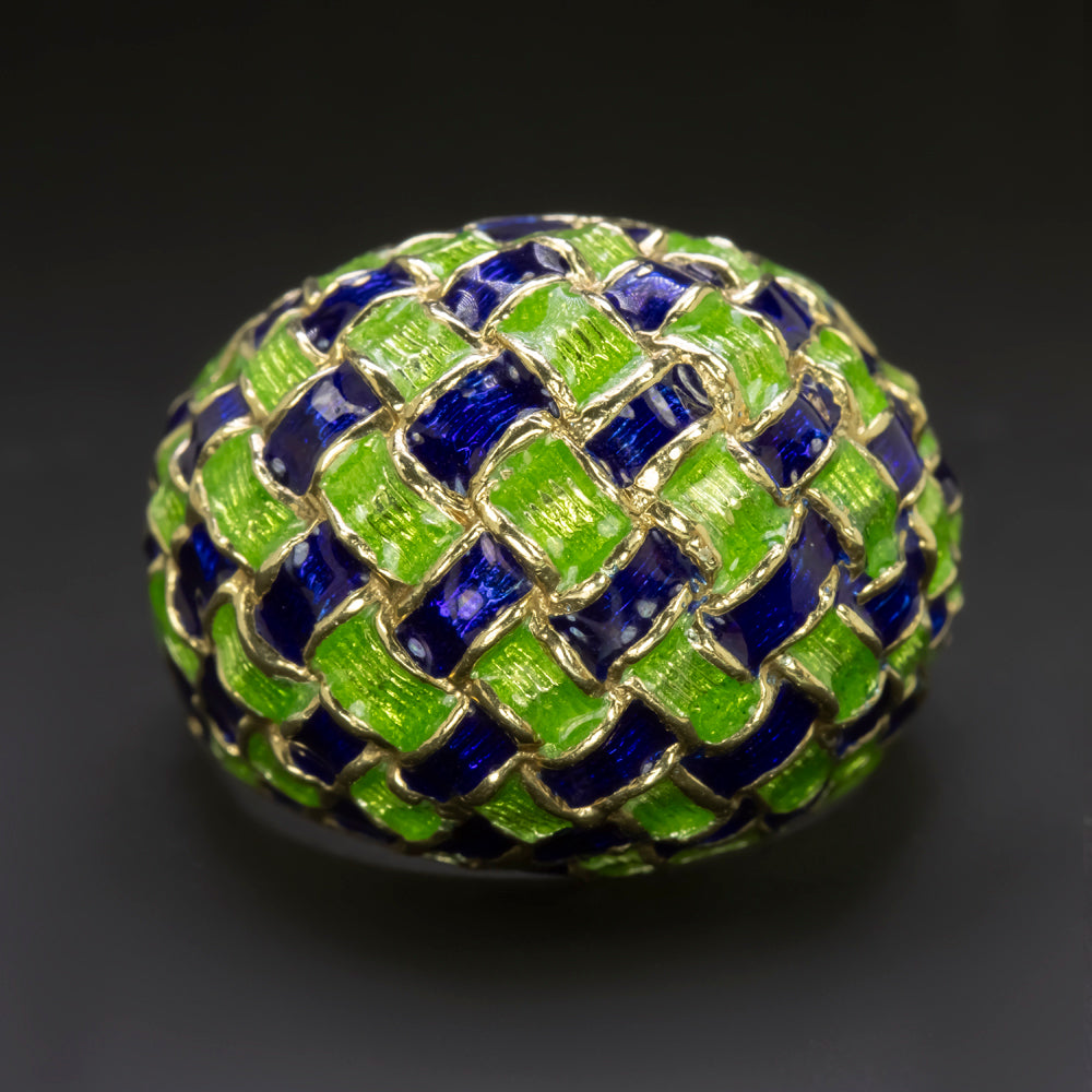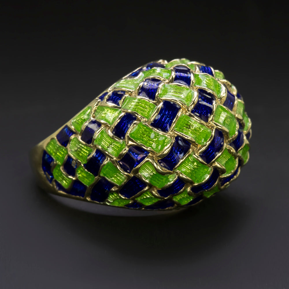 This incredibly unique vintage ring features a domed woven design adorned with bright green and rich blue enamel!