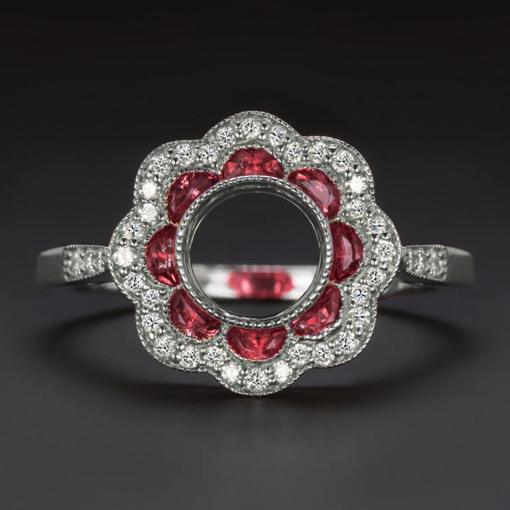 Featured here is a gorgeous diamond and ruby halo engagement ring setting! This unique floral ring was inspired by the 1900s and is full of vintage charm. The bezel setting is great for a round stone that measures 5.9mm to 6.1mm and the ideal size is 6.0mm. If you do not have the perfect stone for this center, be sure to contact us for our loose stone inventory! We are sure to have something that will look complement the ring perfectly. Once set with a center, this ring will make a wonderful engagement ring, or great addition to your own jewelry collection. The halo of rubies are all natural gemstones that have been custom cut to fit this exact ring. They have wonderful saturation and hue that must be seen in person to be fully appreciated. Complementing the ruby halo, is a halo of diamonds. These diamonds are all natural stones, that are bright white and 100% eye clean. They are also well cut resulting in remarkable sparkle and brilliance! The ring is made of solid 14 karat white gold and measures 12.3mm across (north-south) and 3.7mm from the finger to the top of the ring. We are also offering this ring in limited quantities with emeralds or blue sapphires in white gold or rubies in rose gold. We are also offering this style with a smaller center size of approximately 4.7mm also available in the same color gemstone combinations. Included with the sale is a three month warranty on this particular ring presuming that we set the center stone for you. Make this beautiful floral ruby and diamond semi mount yours before it has sold!