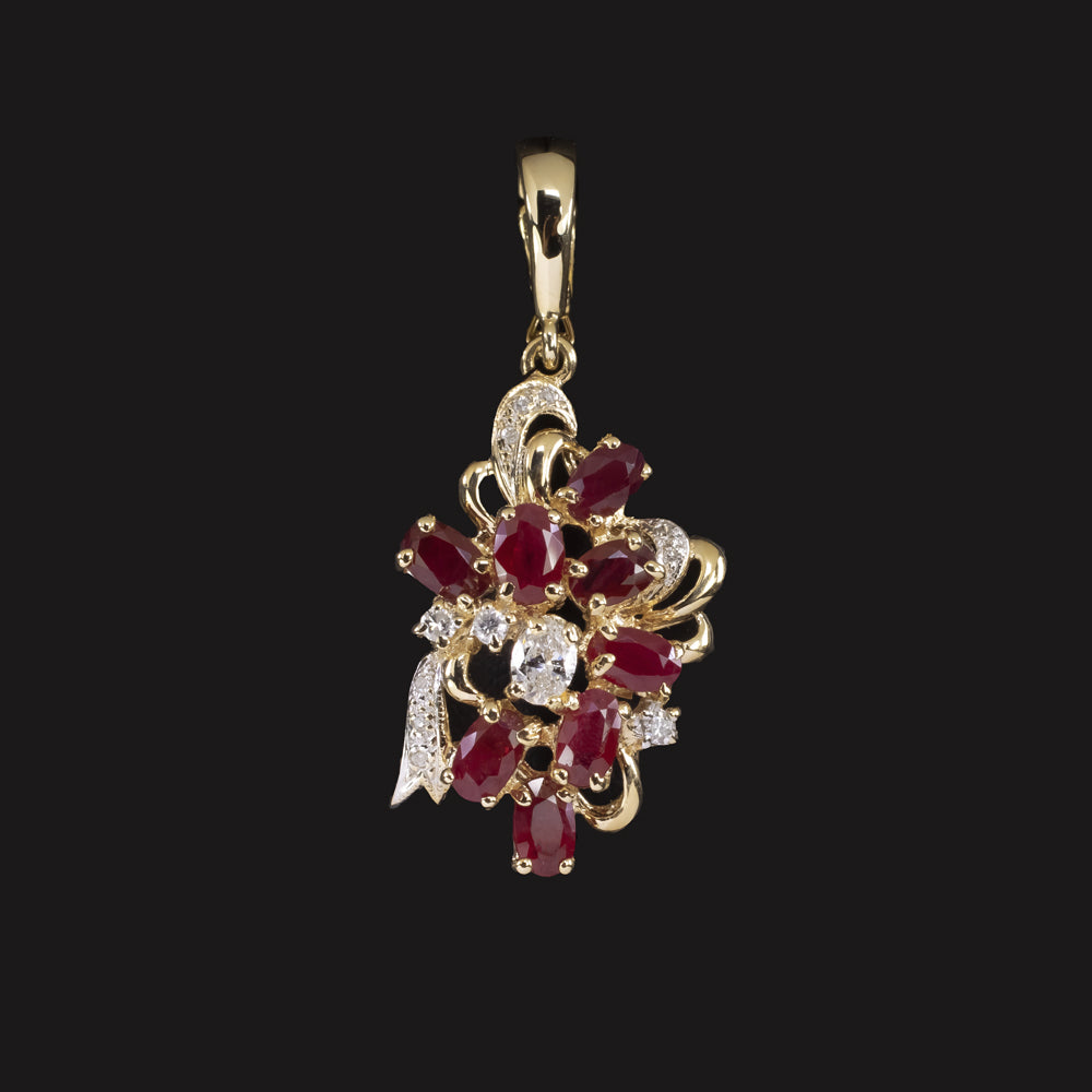 This vintage ruby and diamond pendant has a unique cluster design with rich red rubies interspersed with glittering ribbons of diamonds.