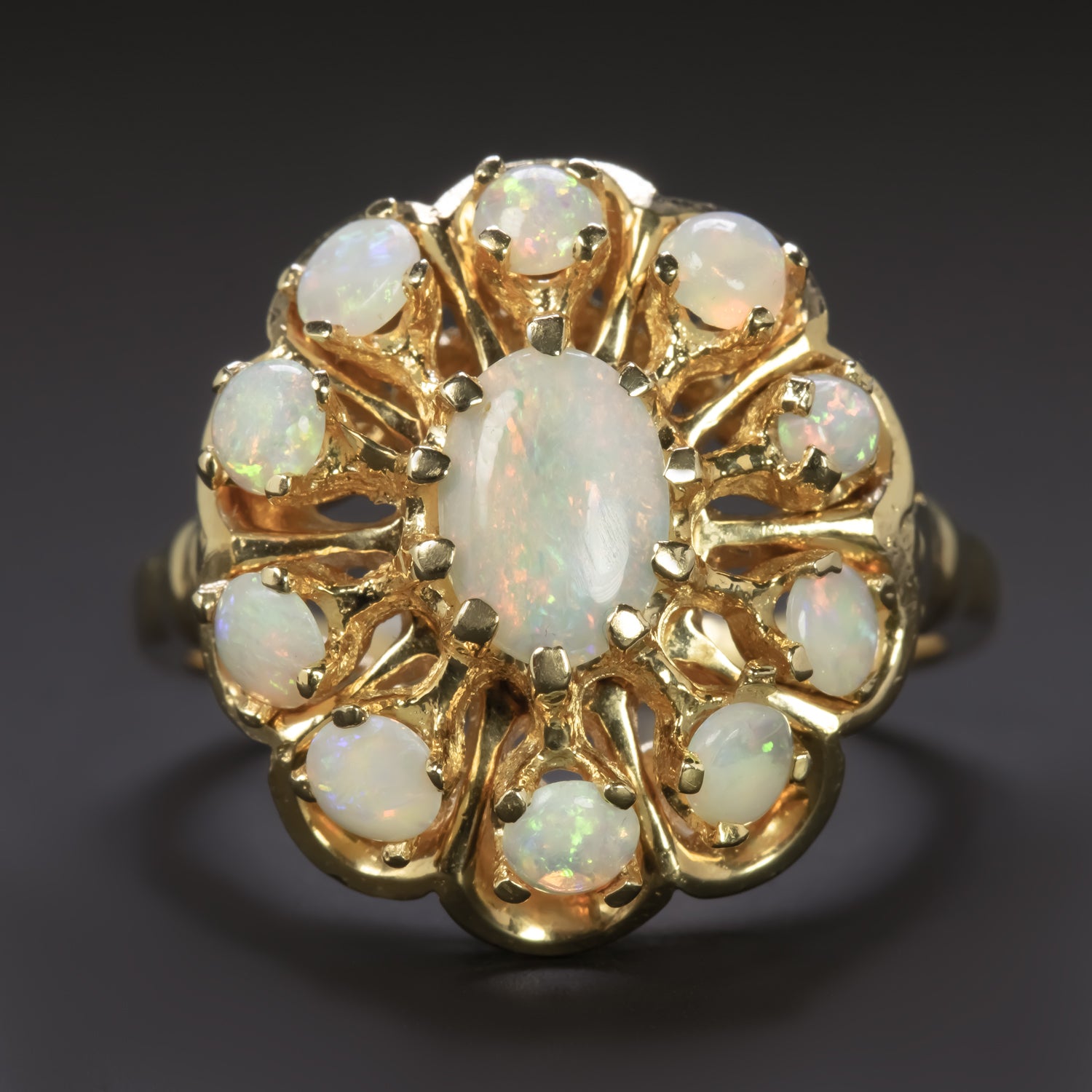 VINTAGE OPAL COCKTAIL RING 14k YELLOW GOLD BIG CLUSTER HALO ESTATE NATURAL OVAL