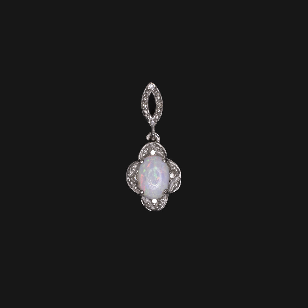 VINTAGE OPAL DIAMOND PENDANT 14k WHITE GOLD SCALLOPED HALO NATURAL OVAL NECKLACE
