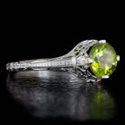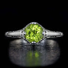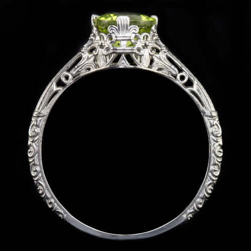 Featured here is a stunning peridot ring reminiscent of the 1920s Art Nouveau era. This beautiful ring features a single round cut natural peridot (0.85ct) firmly prong set in the solid 14K White Gold band. This lovely peridot measures 6.50mm wide. This ring features beautiful detailing characteristic of the art nouveau movement of the early 1900's. The filigree and floral design is very beautiful as well! This lovely ring measures 8.40mm wide and weighs 2.10 grams. It is a size 6.5 with resizing available.