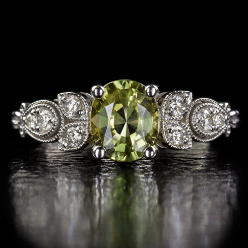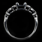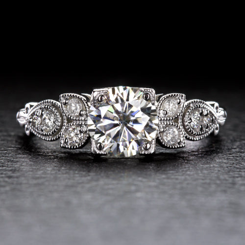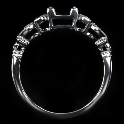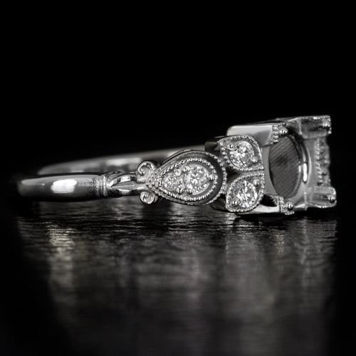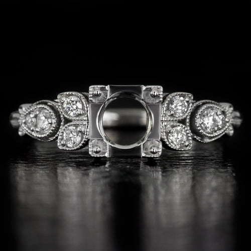 Featured here is an enchanting diamond engagement ring setting inspired by the retro glamour of the early 1900s! This gorgeous semi-mount ring will be the perfect showcase for any diamond or gemstone! The center mounting is ideal for a symmetrically shaped stone such as a round or cushion. It will fit a round diamond that measures between 5.8mm and 6.7mm with an ideal size being 6.5mm to 6.7mm. This beautiful design is accented by natural diamonds creating the look of organic pear shapes. This is a wonderful early Art Nouveau inspired design that will make the perfect engagement or cocktail ring. Eight bright white and eye clean diamonds are securely prong set in the sides of the ring. The ring features a lovely floral design that has been finished with milgrain beading for a touch of elegance. The ring is made from solid 14 karat white gold and the measurements are 6.2mm across (north-south) and 4.8mm from the finger to the top of the center mounting. If you are searching for a perfect center stone, please contact us for our diamond and gemstone inventory. The center stones shown are for inspiration only. This item is a semi-mount ring with no center. Make this gorgeous diamond semi-mount ring part of your collection! This alluring old world design can only be found here!