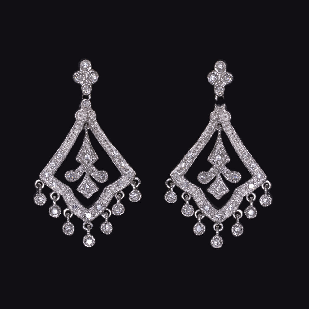 These vintage style diamond earrings have an eye catching chandelier design with an elegant scalloped shape and twinkling diamond dangles.