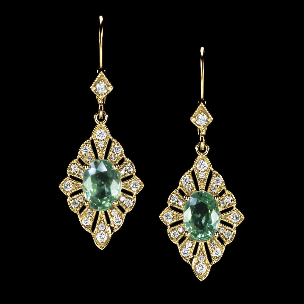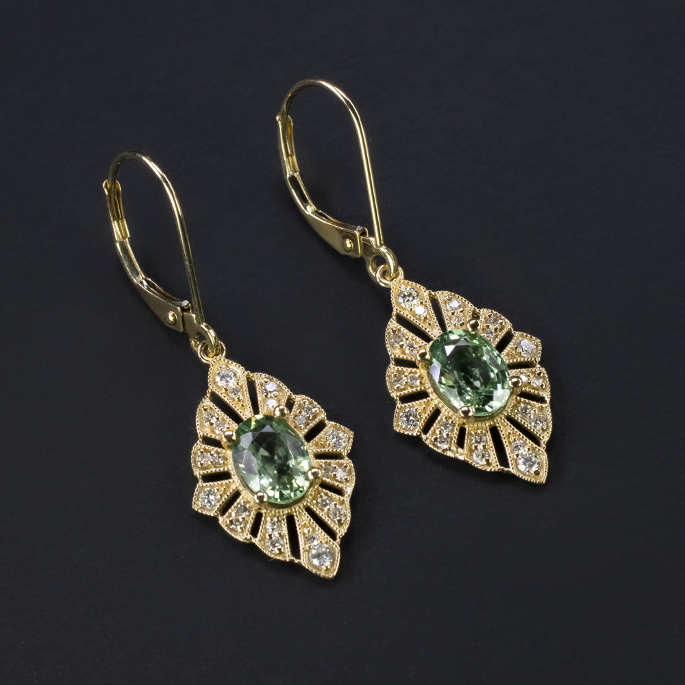 These sapphire and diamond dangle earrings feature a pair of bright green sapphires surrounded by an eye-catching Art Deco style halo design.